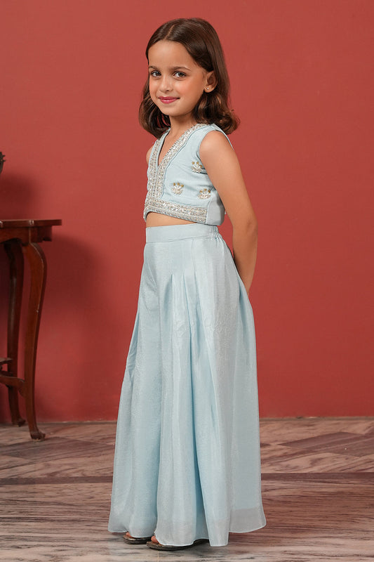 Blue Handcrafted Crop Top & Flared Pants Set for Girls