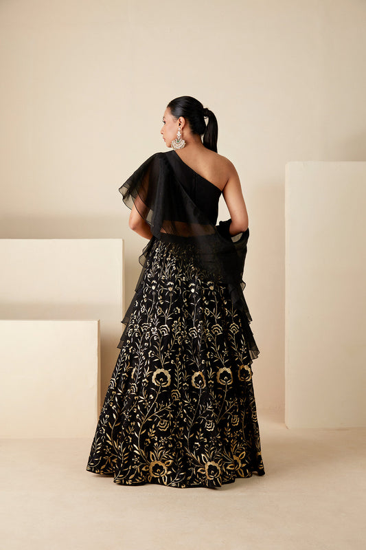 Black One shoulder Lehenga Set
