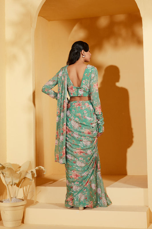 GREEN PRE DRAPE FLORAL SAREE