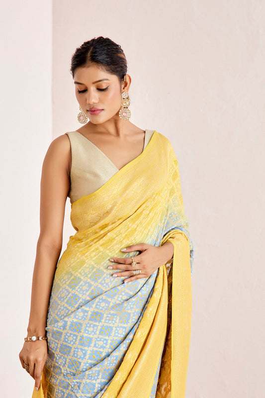 BLUE YELLOW OMBRE BANARASEE BANDHANI SAREE