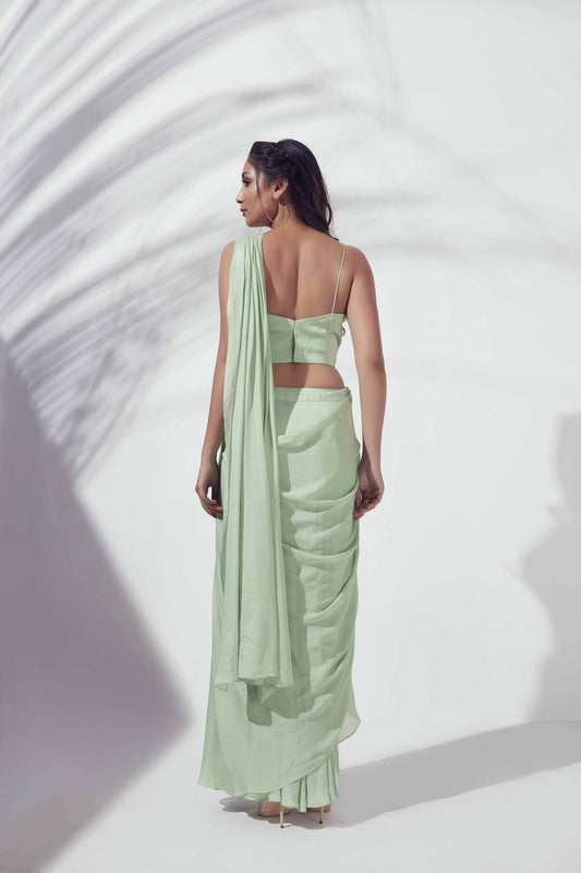 Green Pre-Draped Skirt Saree Set