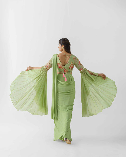 Green Hand Embroidered Pre-Draped Saree Set