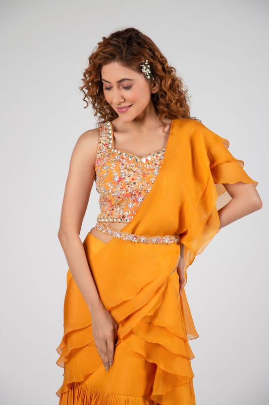 Mustard Pre-Draped Pant Saree Set