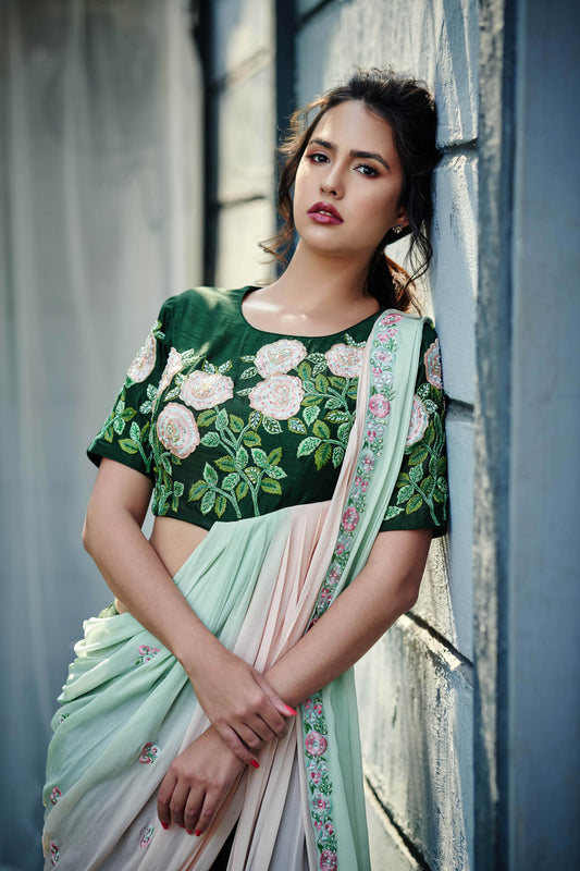 Blaze Orange & Sea-Green Pleated Skirt Lehenga Set