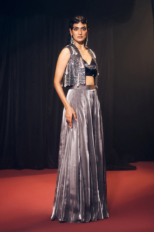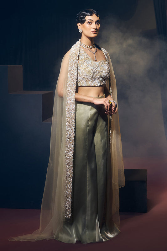 Flawless Drape Skirt Set with Embroidered Blouse & Cape