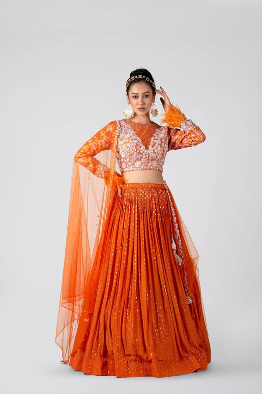 Blaze Orange Pleated Lehenga Set