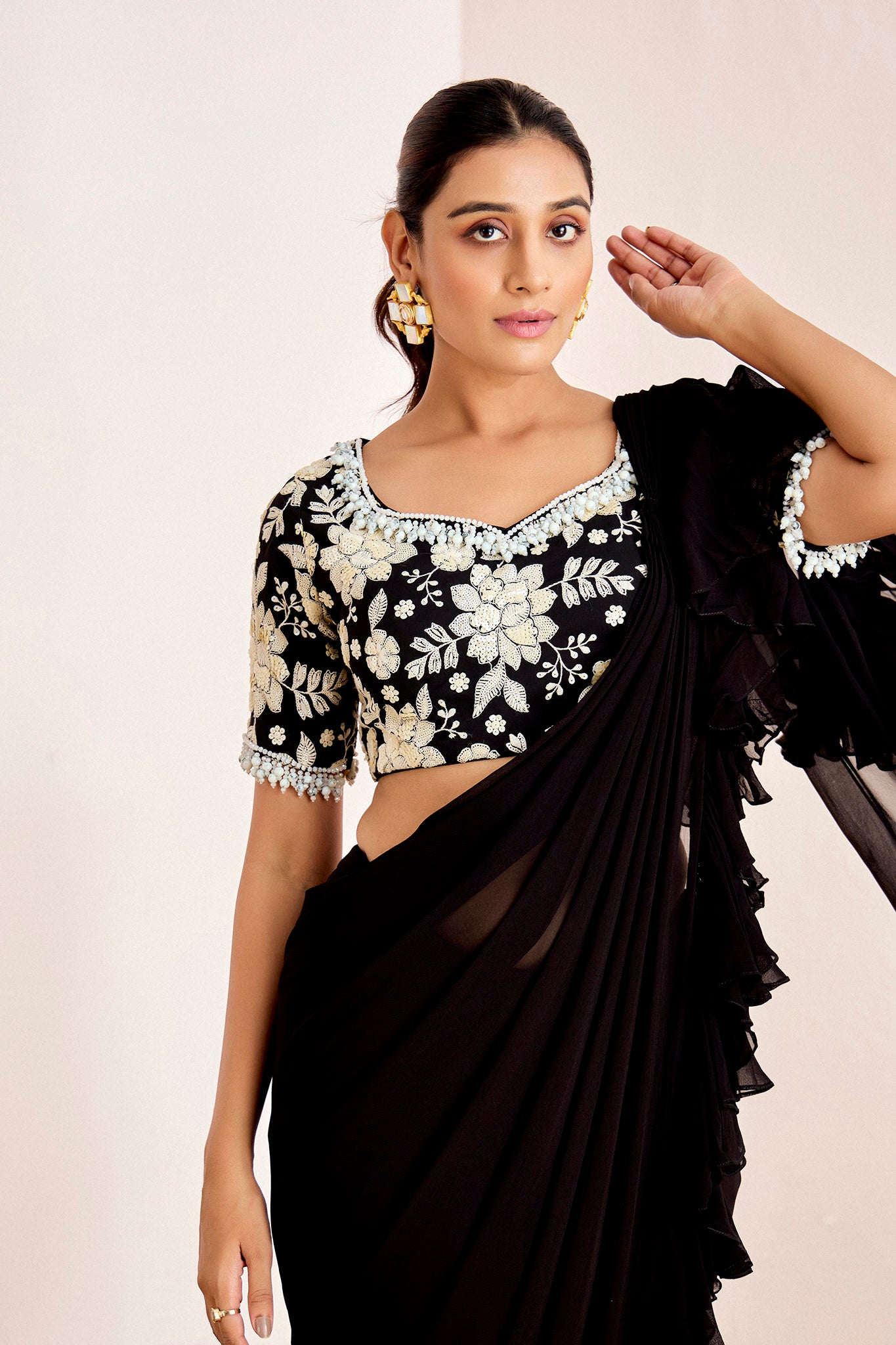 Heavy embellished blouse and pre drape saree with ruffles. Pearl drop details on neckline and sleeve hem.