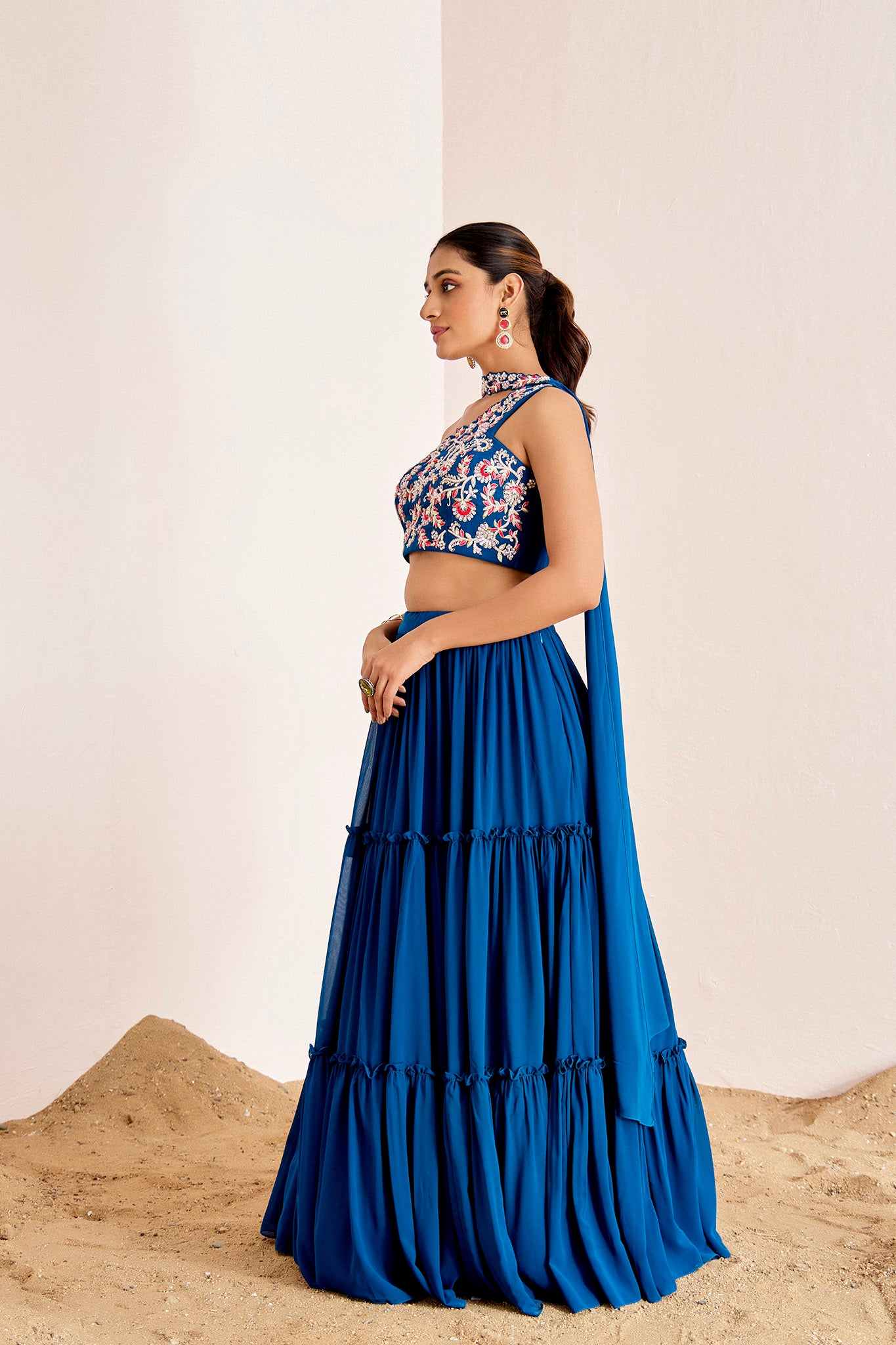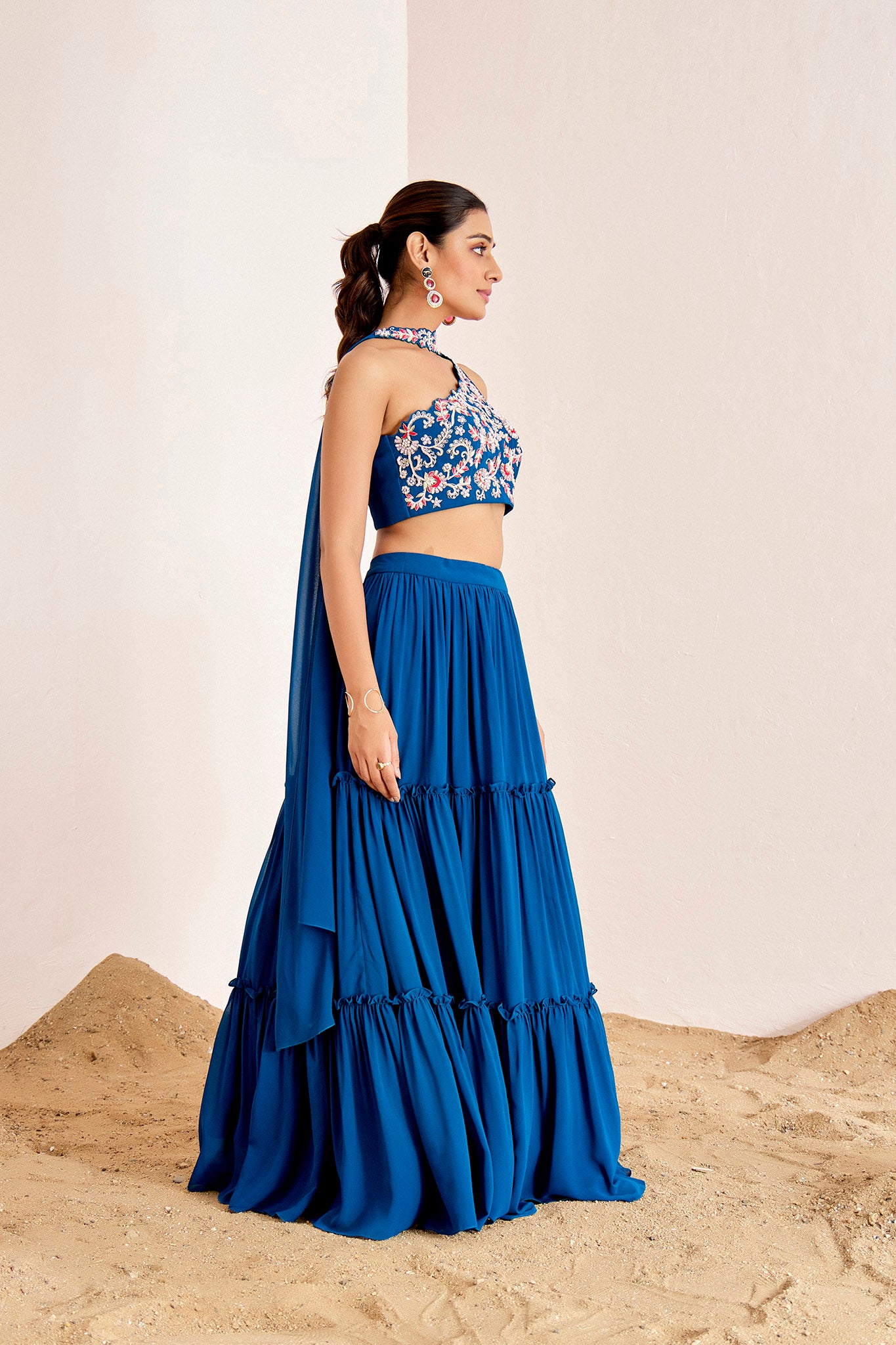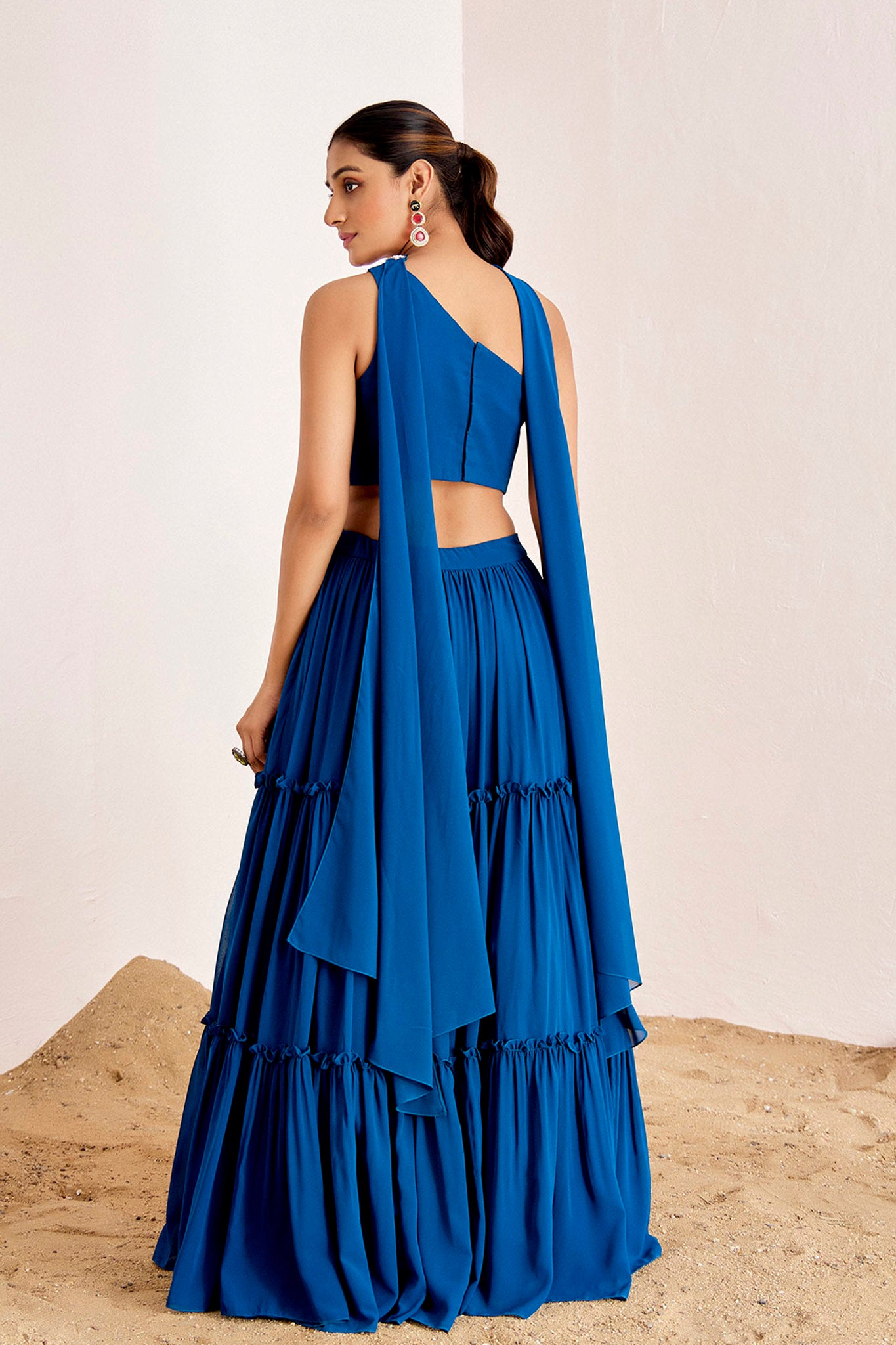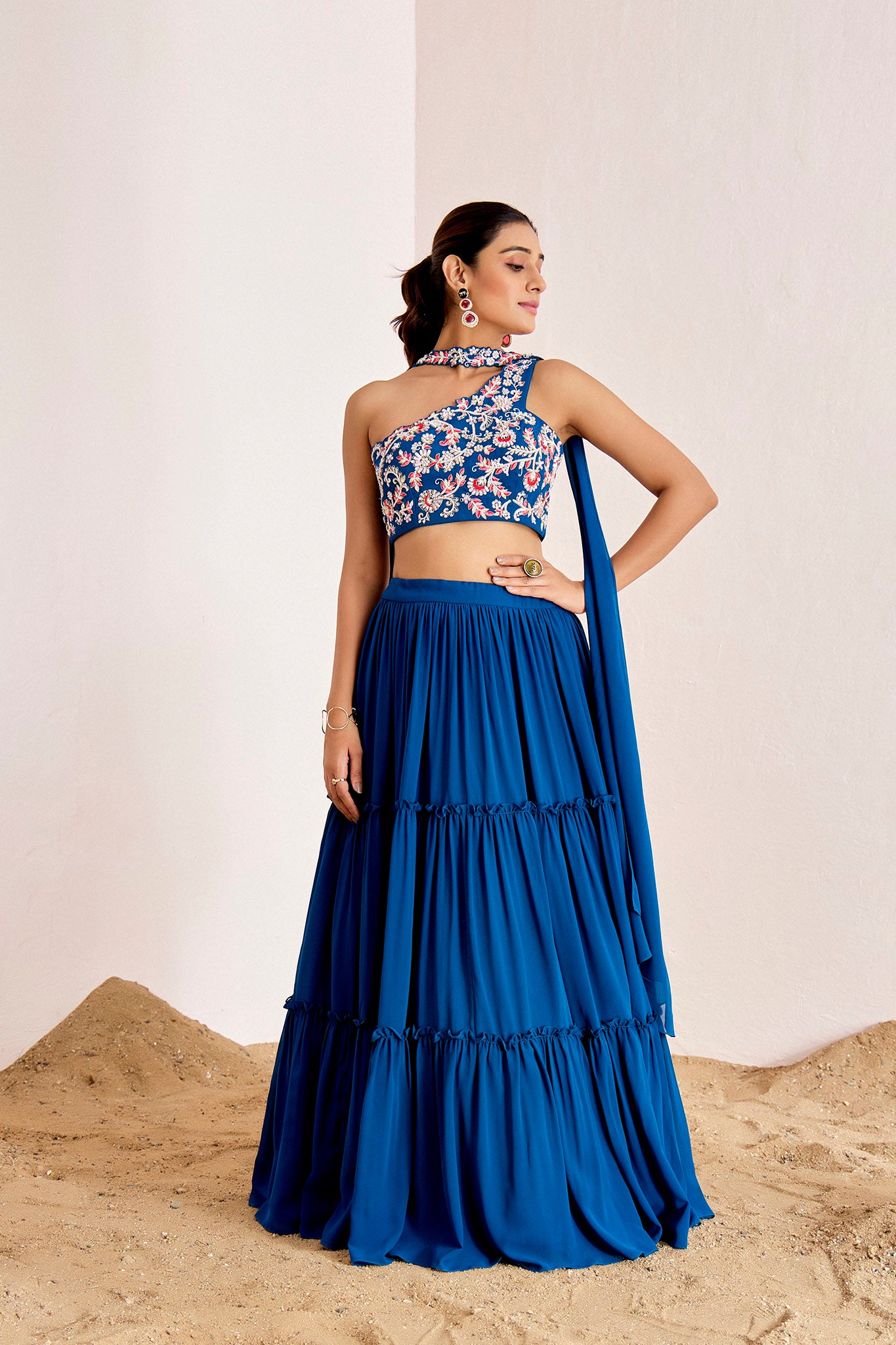 BLUE ONE SHOULDER THREE TIRED LEHENGA SET