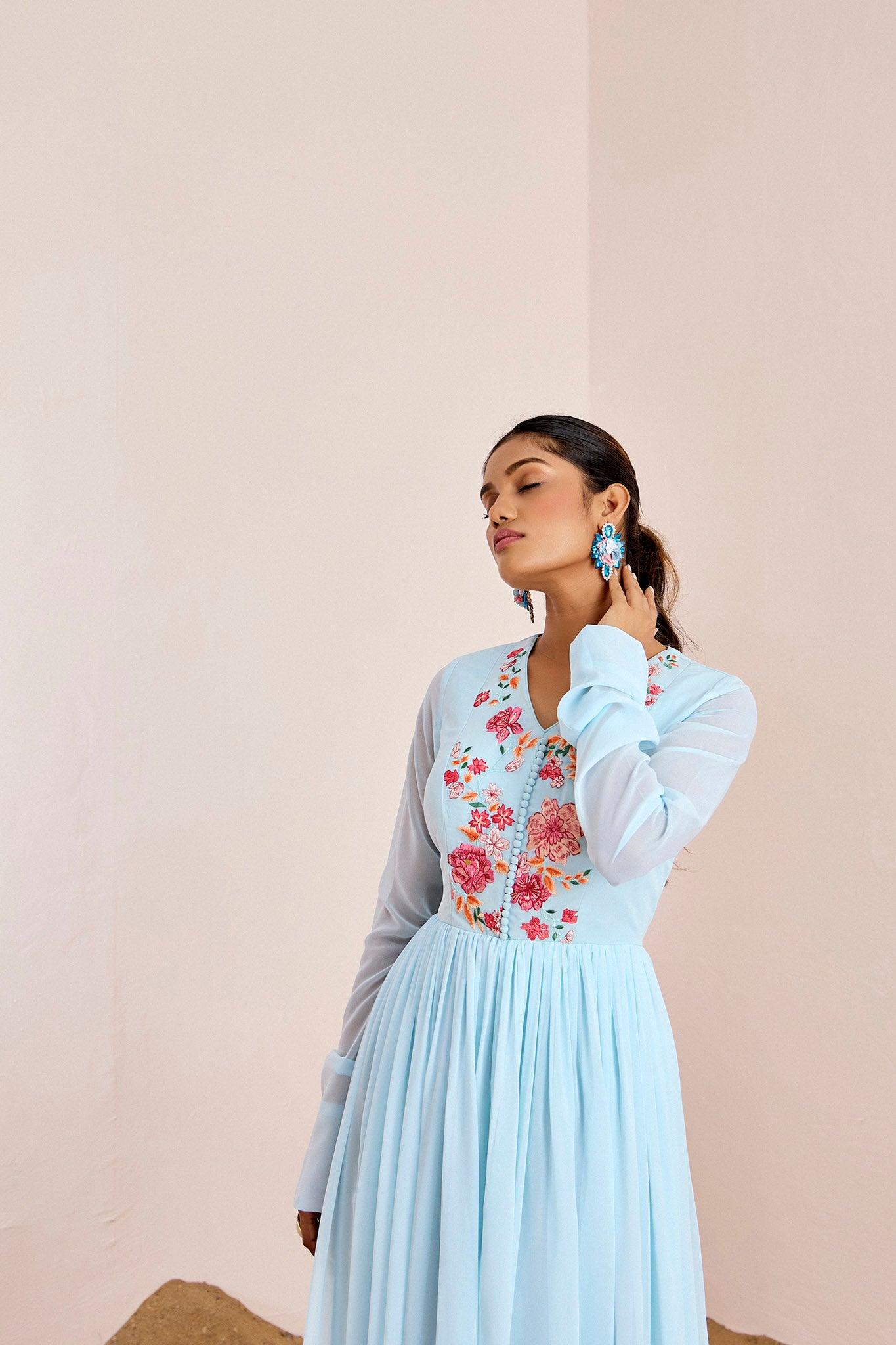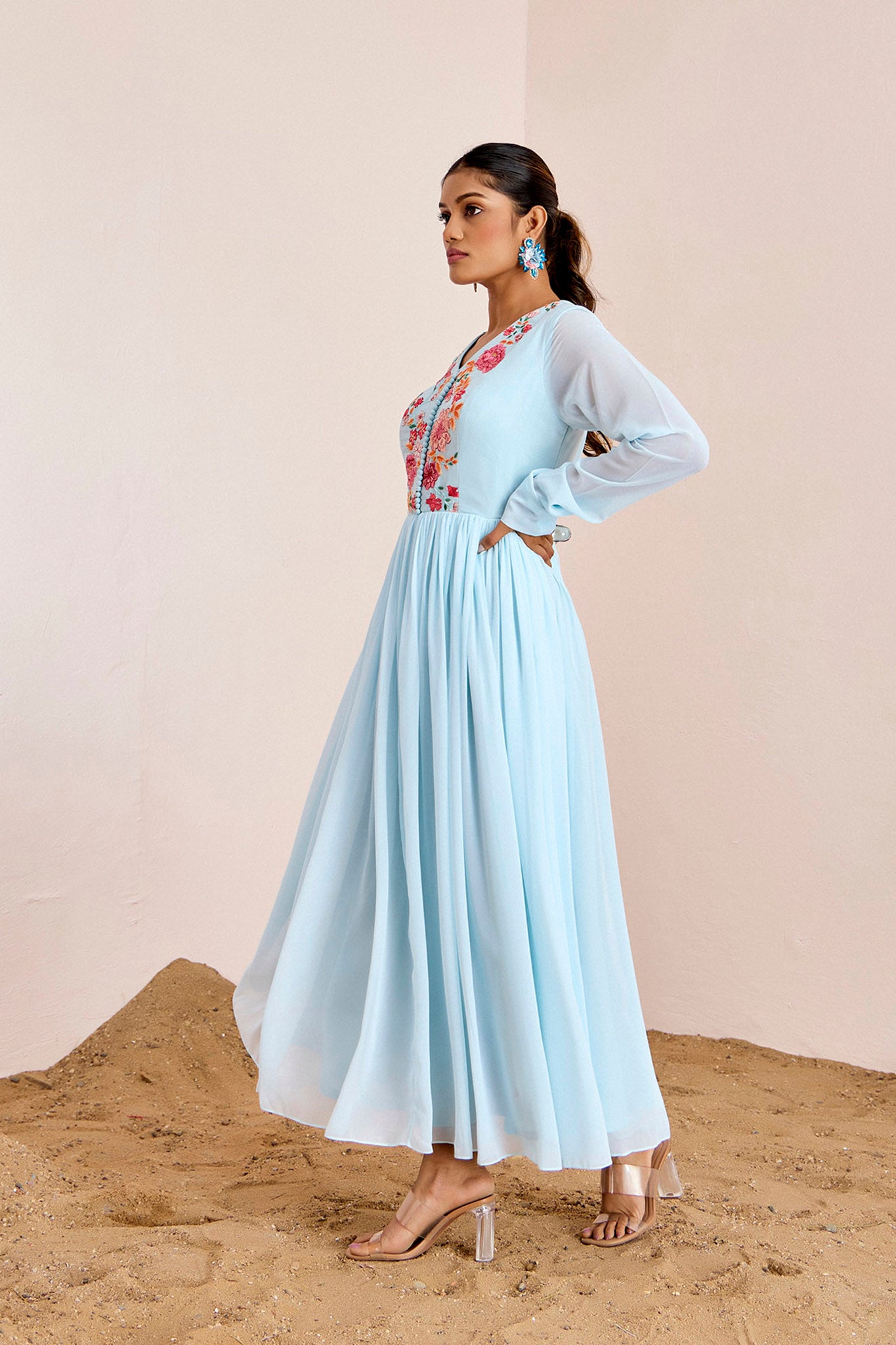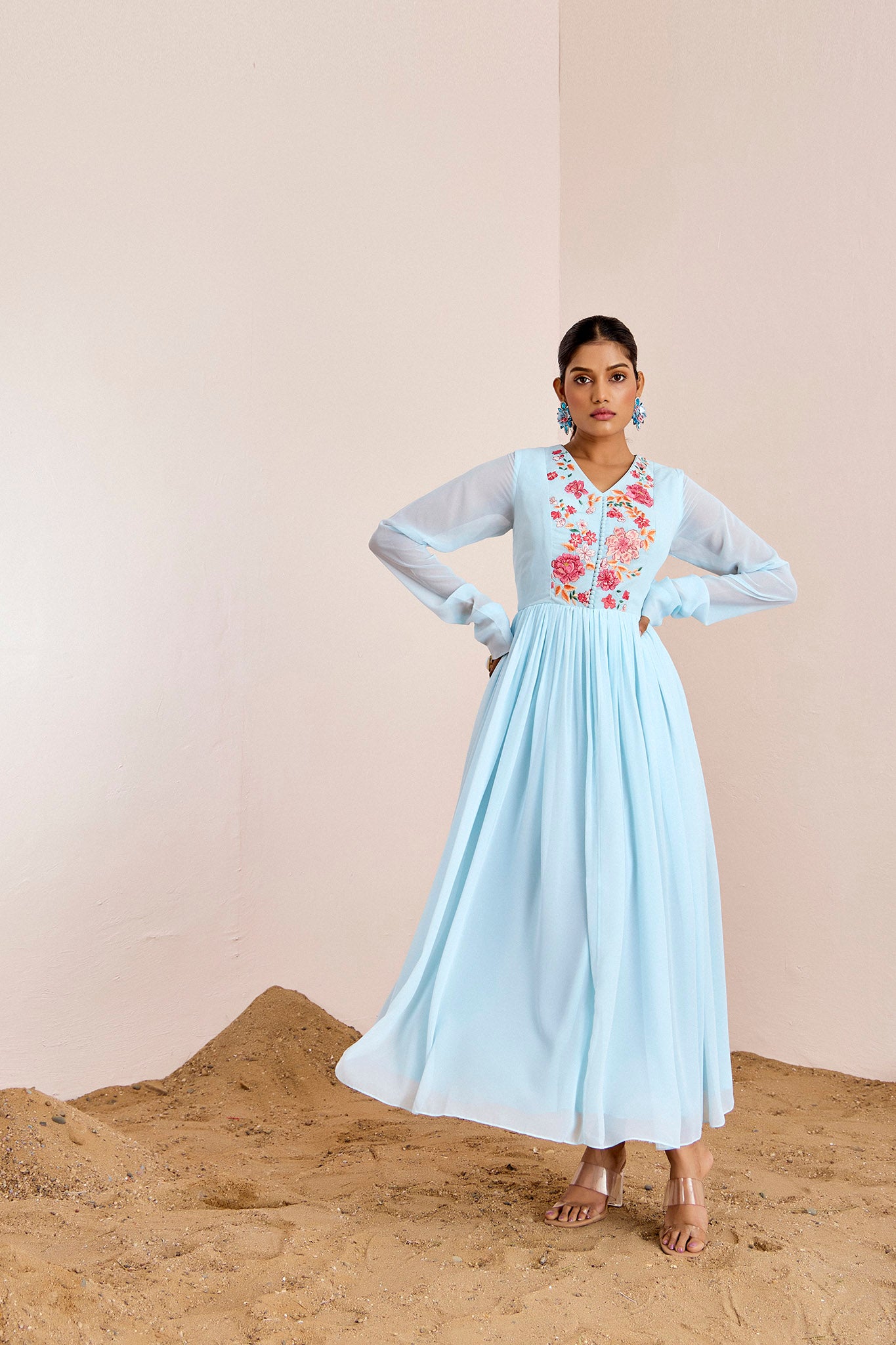 Beautifully thread embroidered floral gown with gathers.
