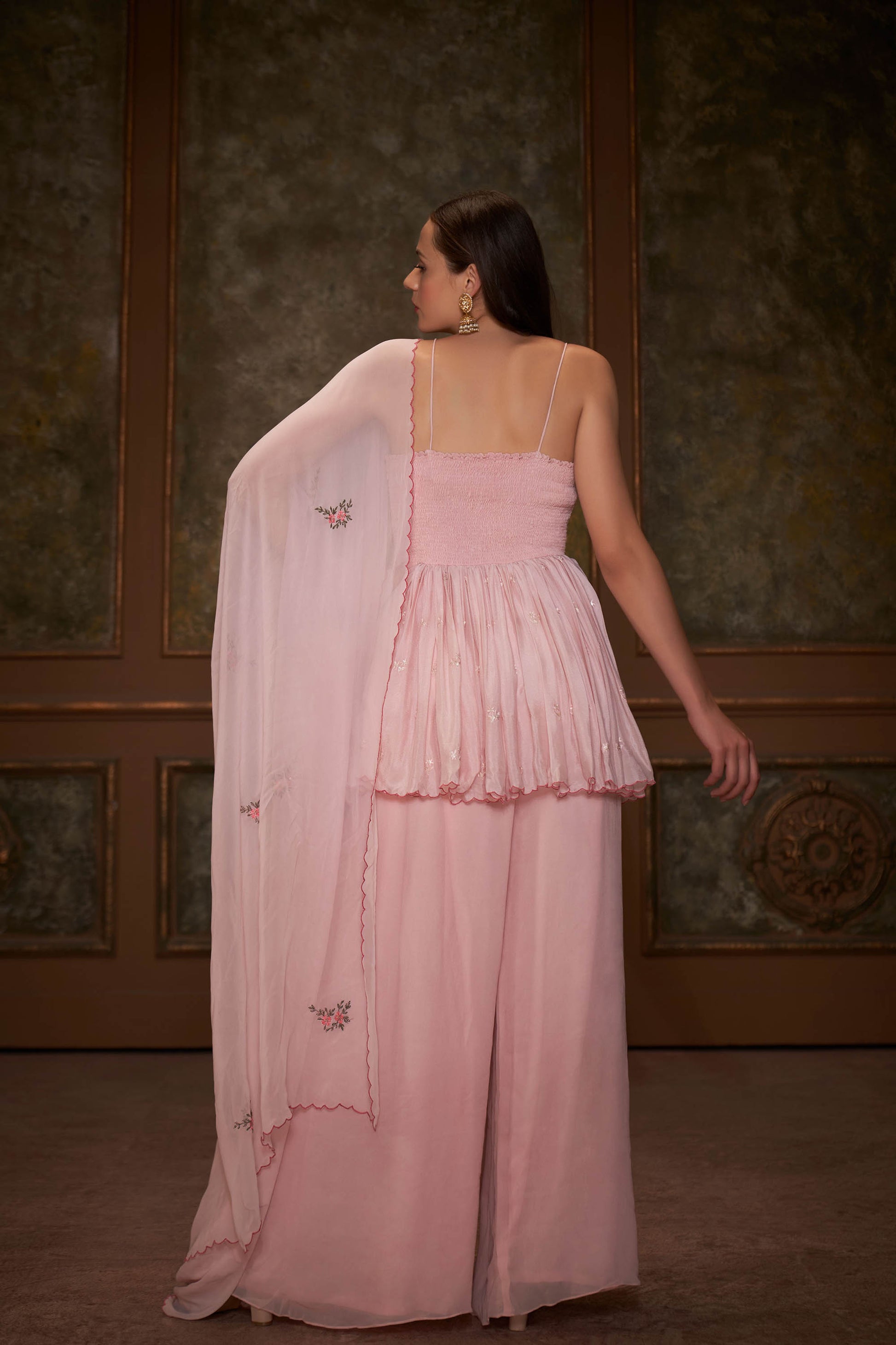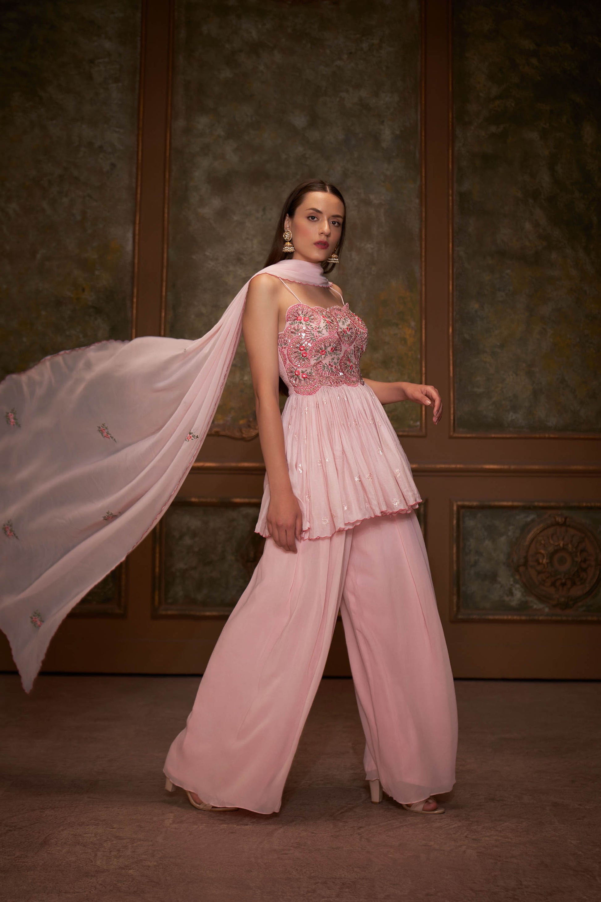 and tubes. The pants are palazzo. The dupatta has scalloped