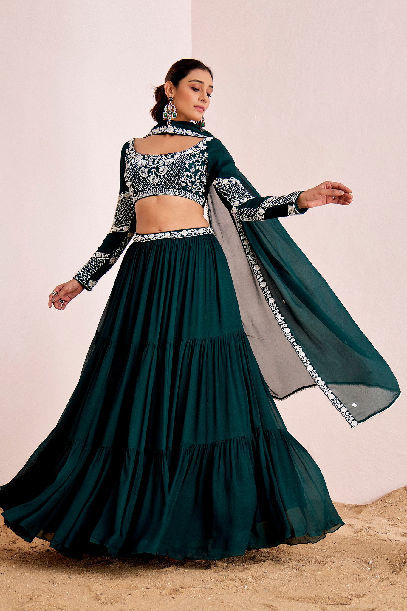 BOTTLE GREEN LAYERED LEHENGA SET