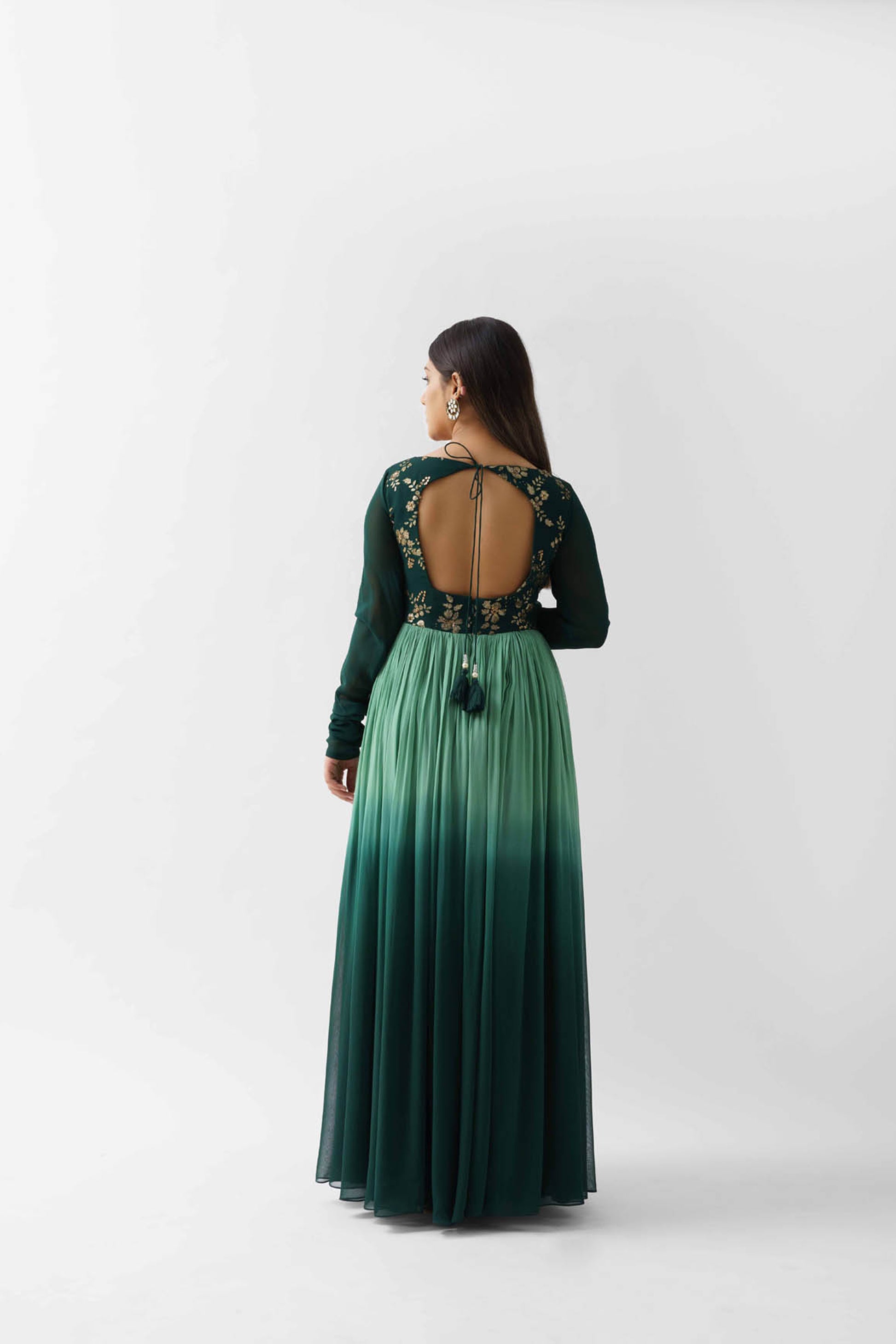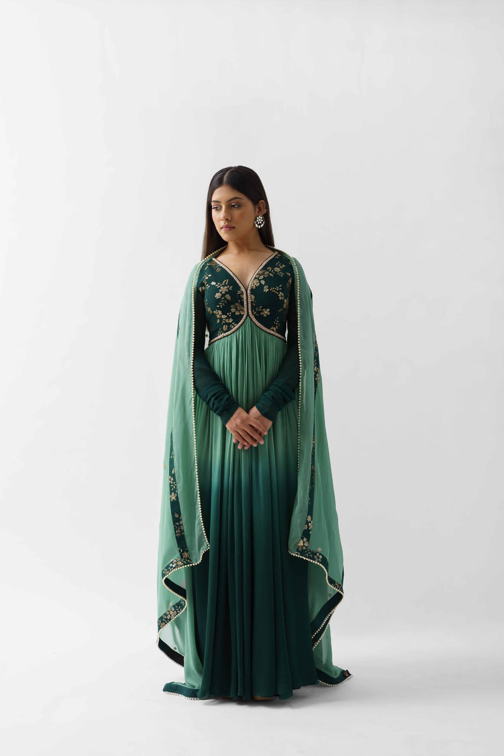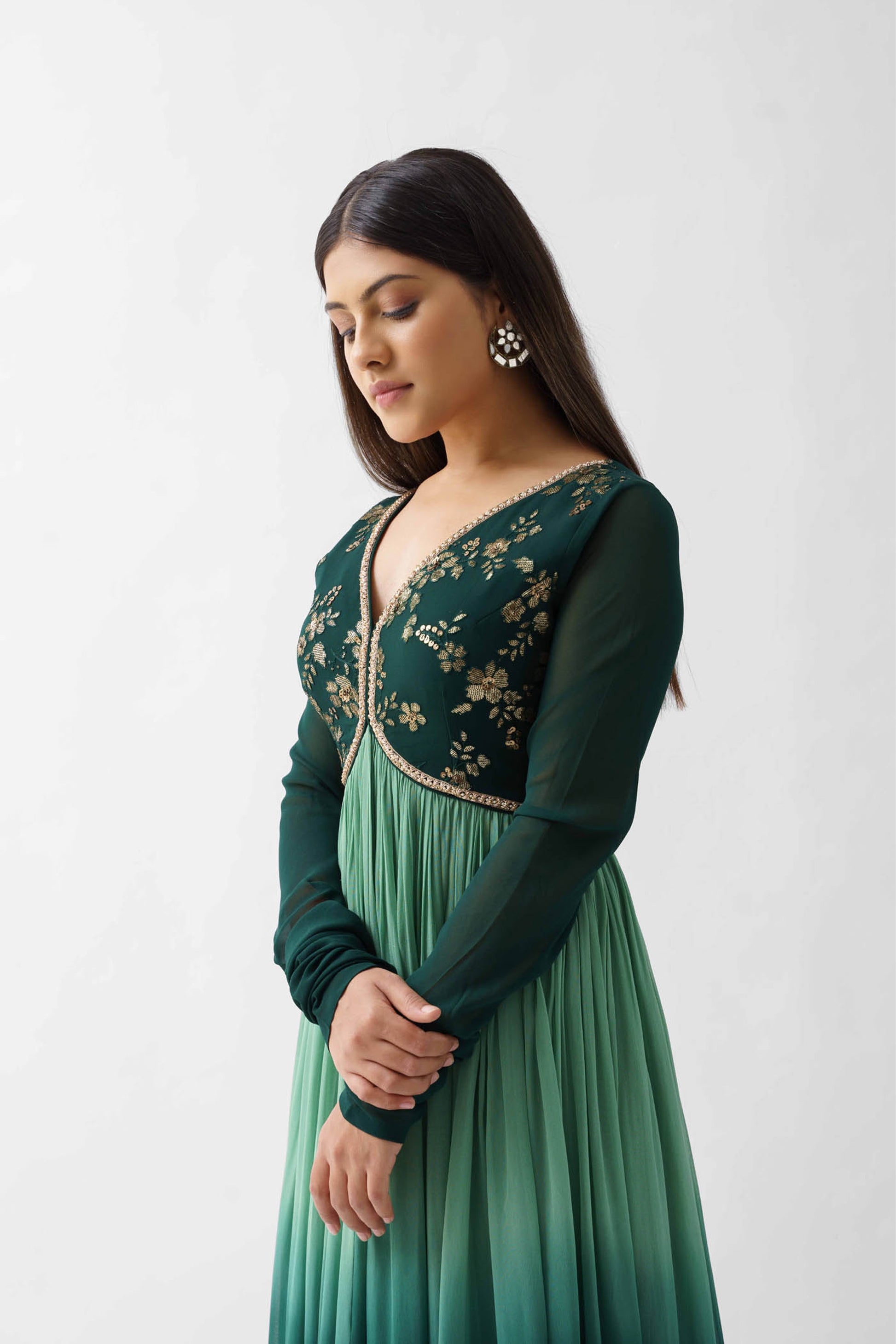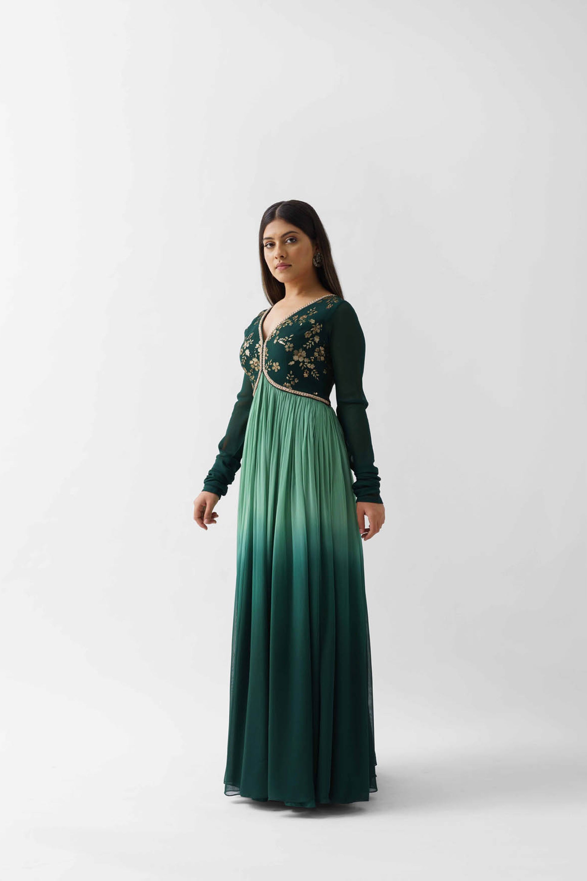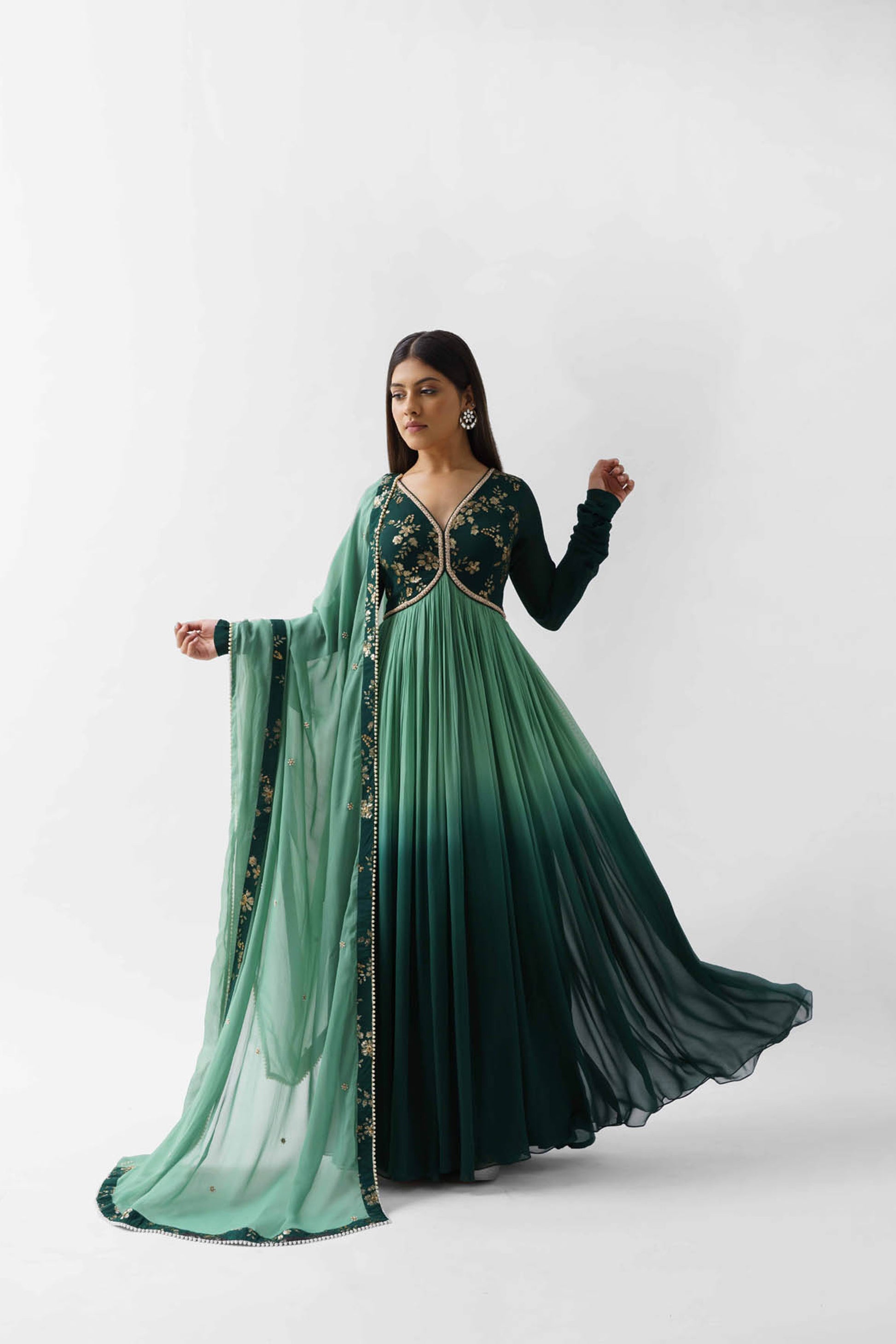 Green Ombre Embroidered Pleated Anarkali Set