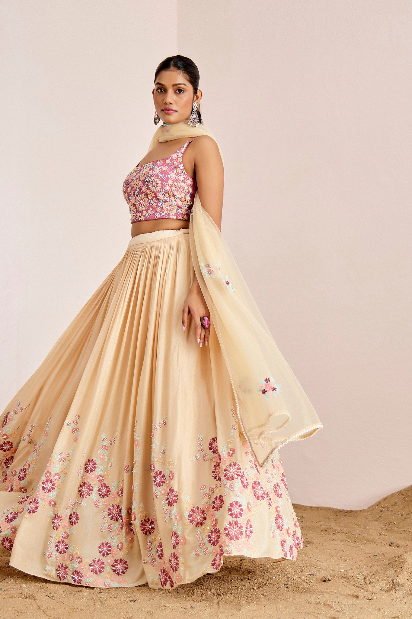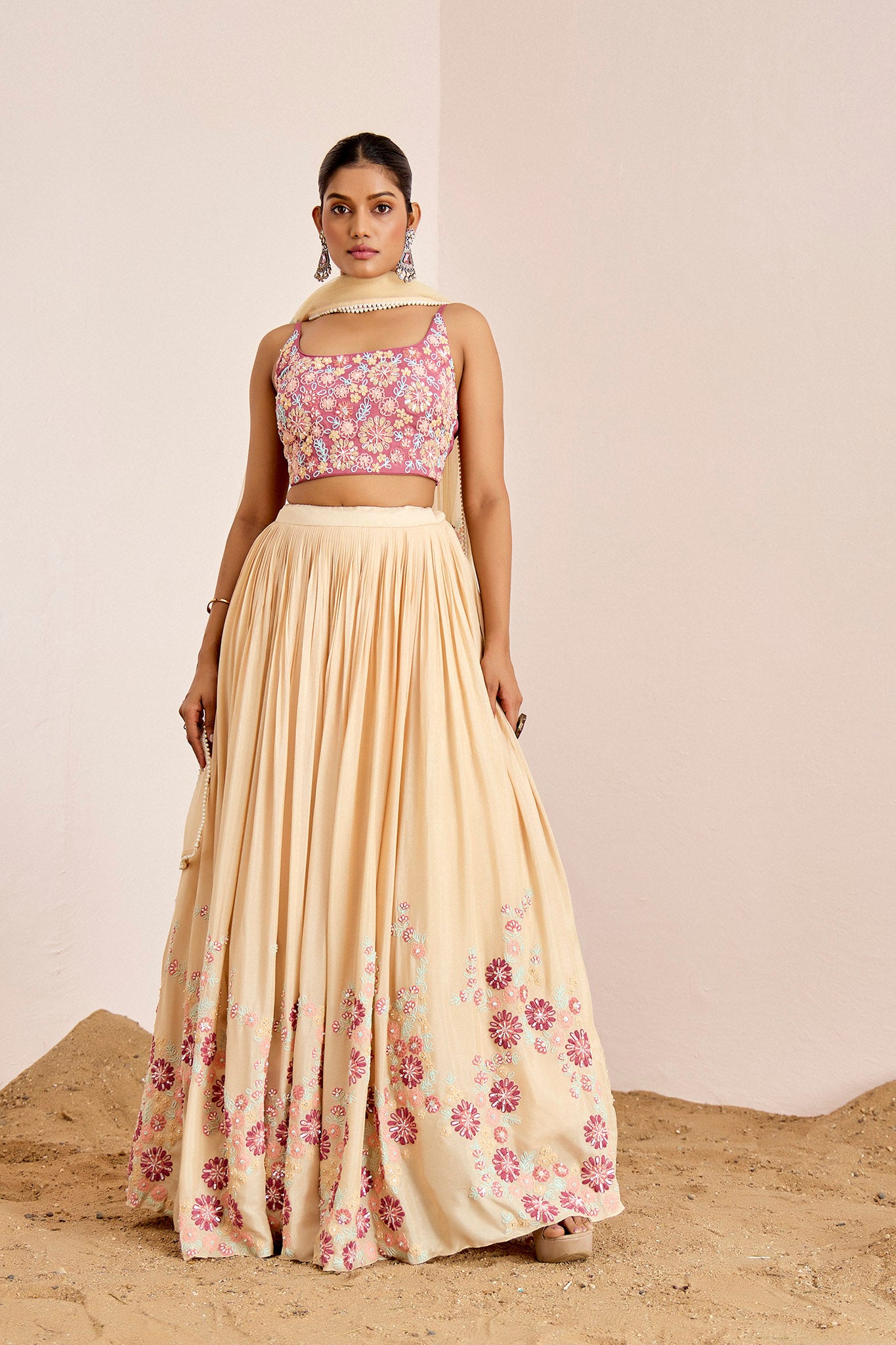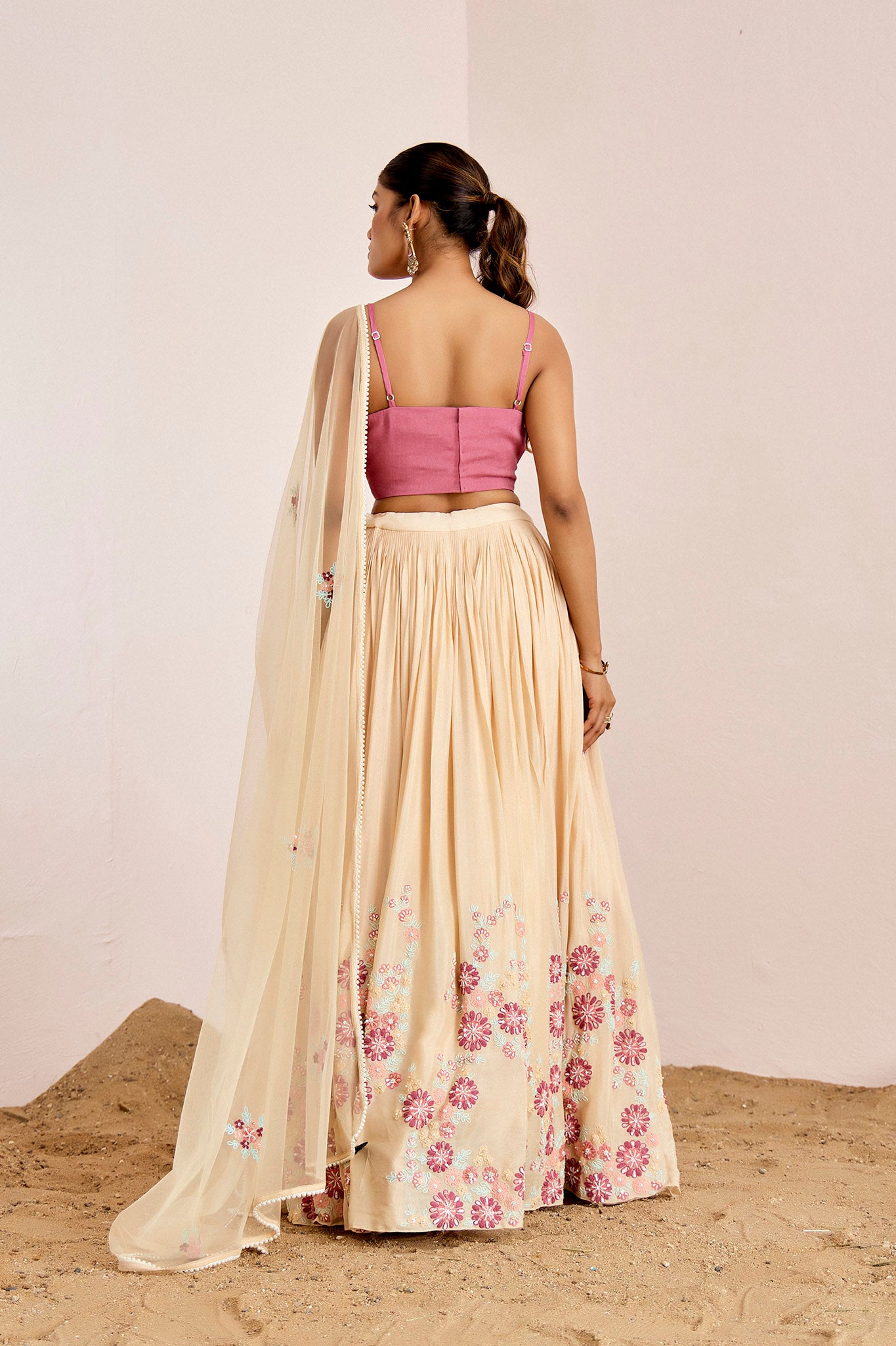 Hand embroidered blouse with pleated lehenga and net dupatta