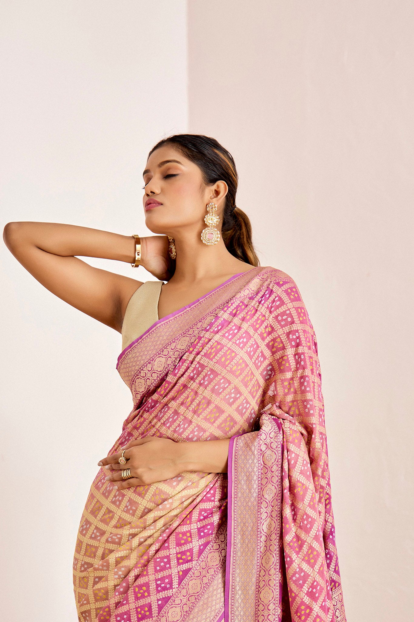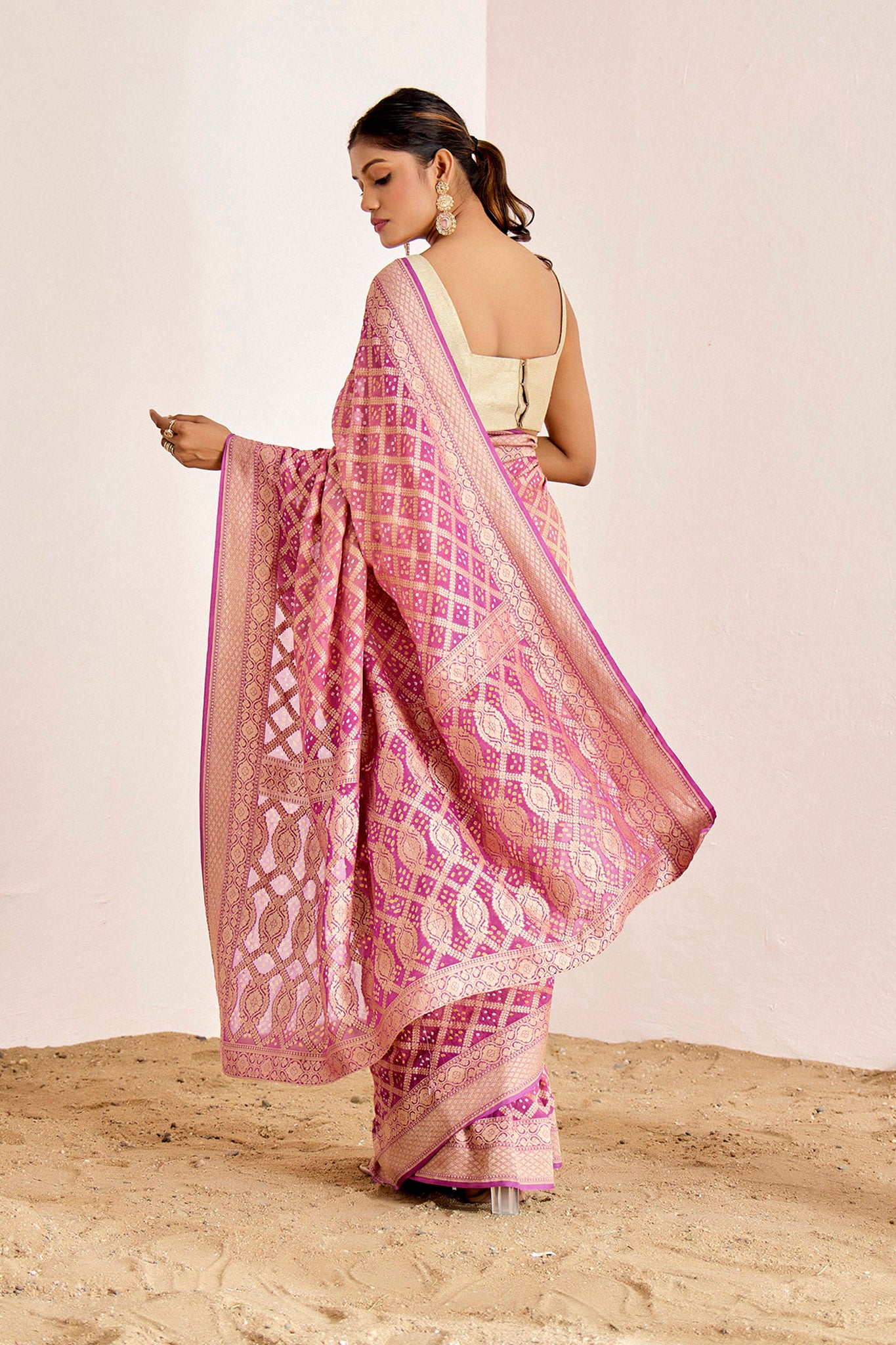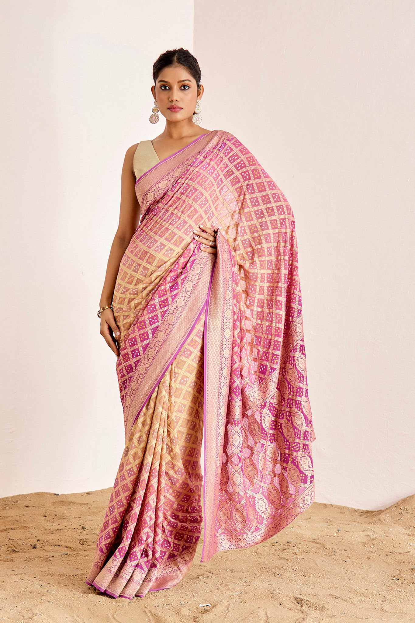 Traditional banarasee bandhani saree in modern colors.
