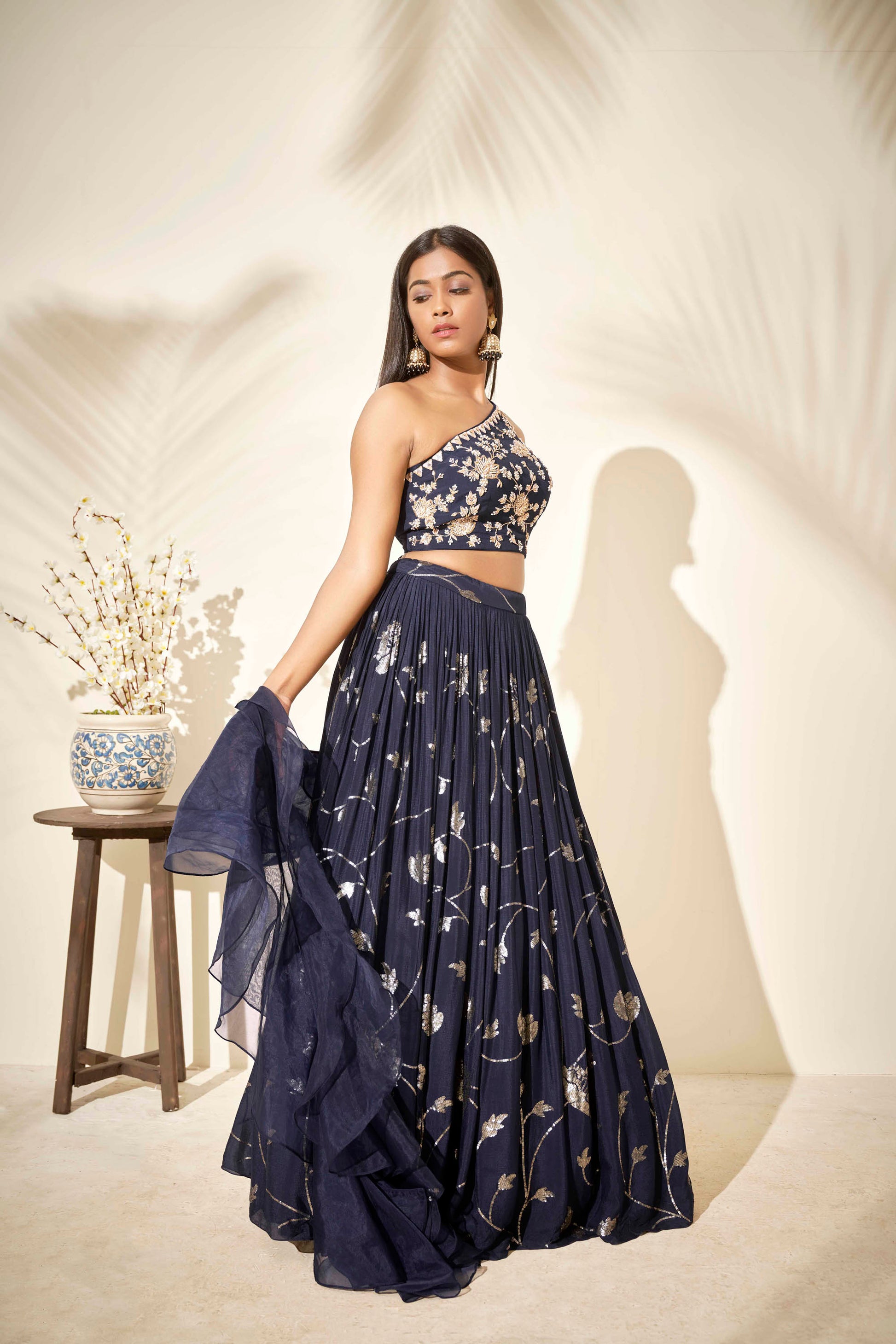 One shoulder lehenga with zardosi hand embroidery crop top.