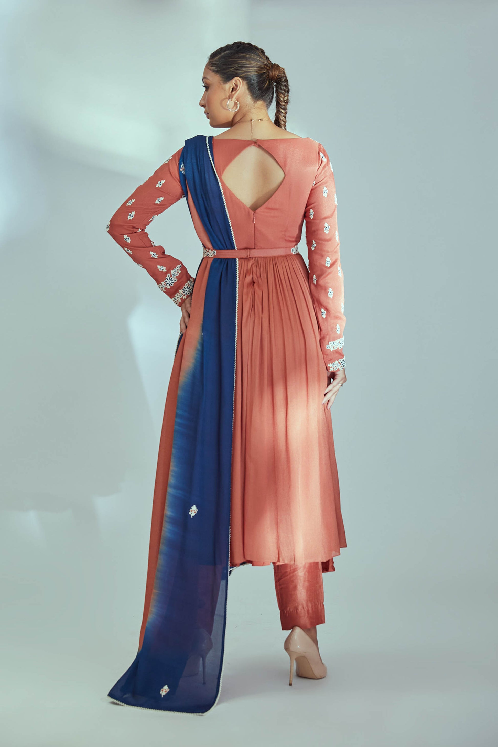 The ombre dupatta is emrboidered in thread details & pearl border.