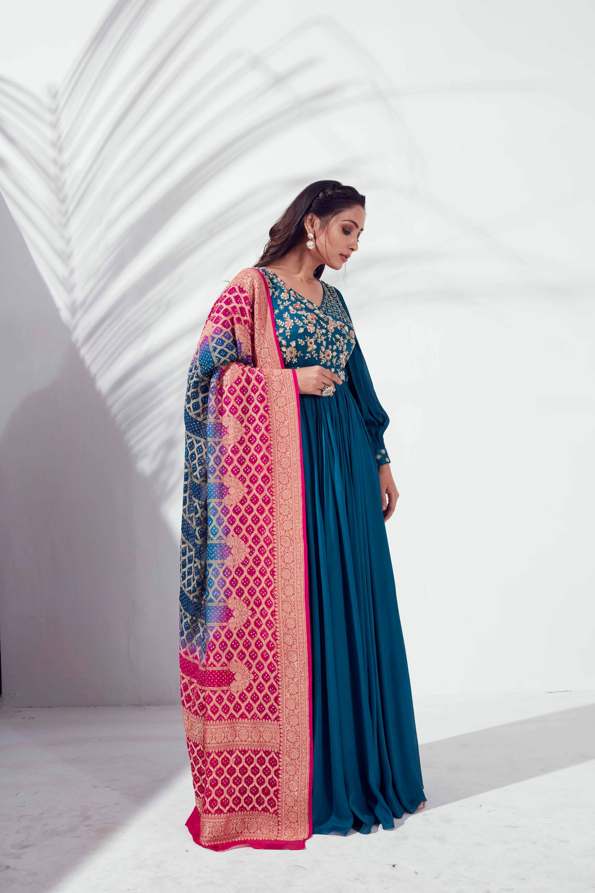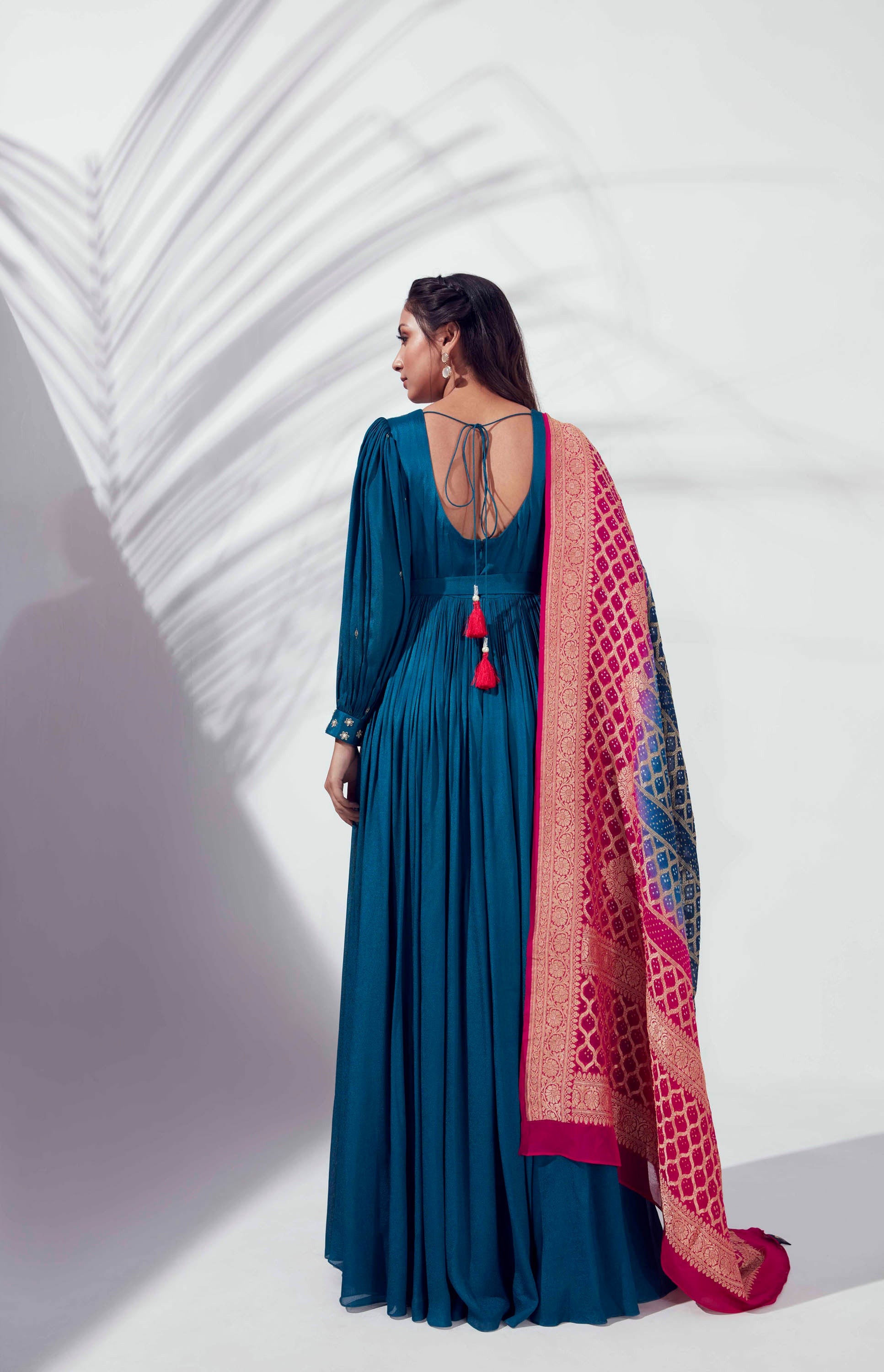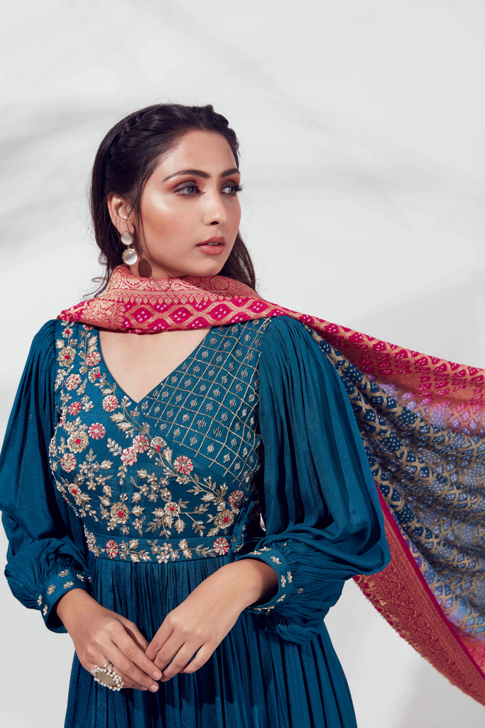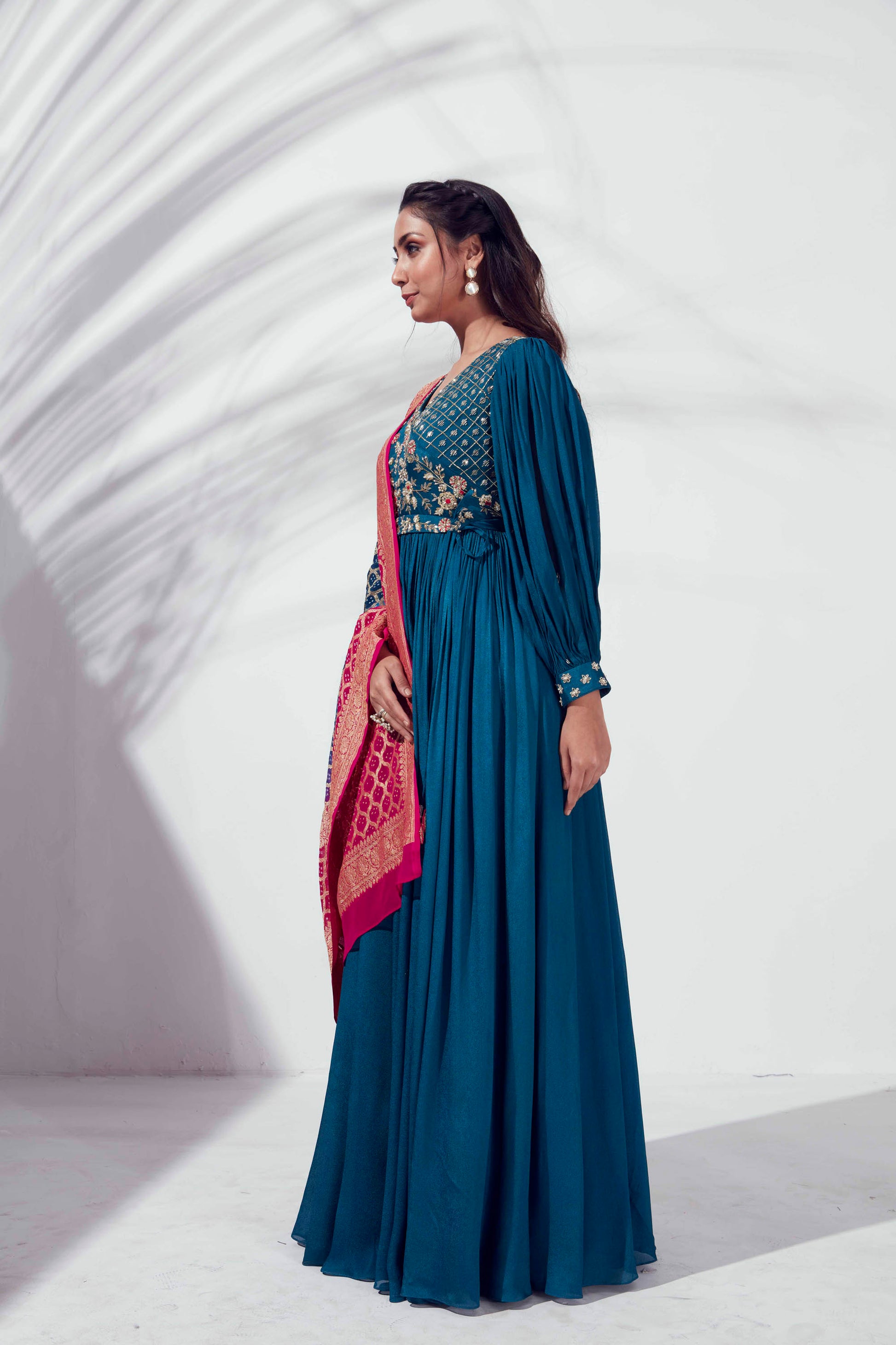 Peacock Blue Embroidered Angrakha Anarkali Set