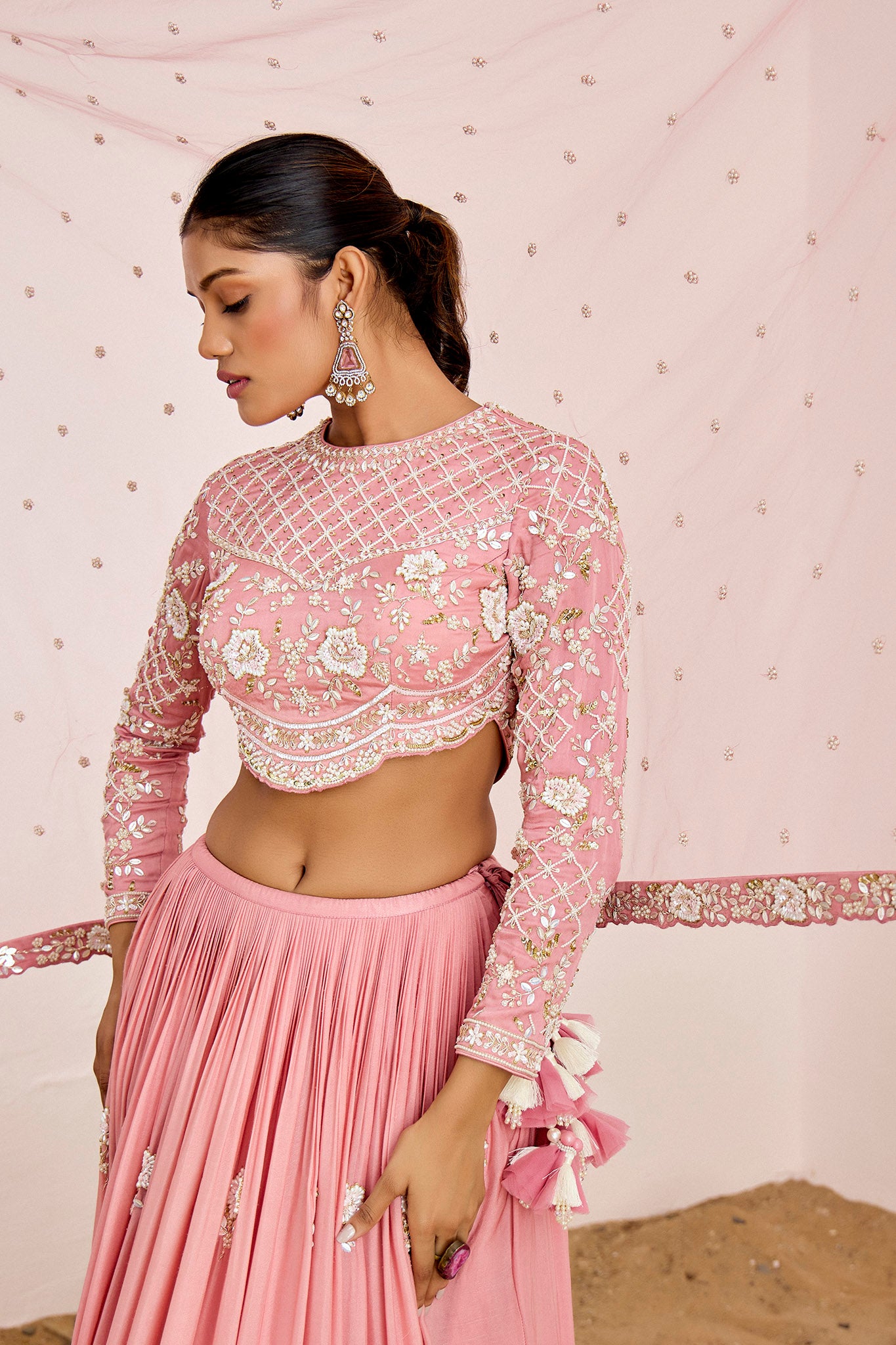 Beautifully hand embroidered lehenga and net dupatta with butis and cutwork on all sides.