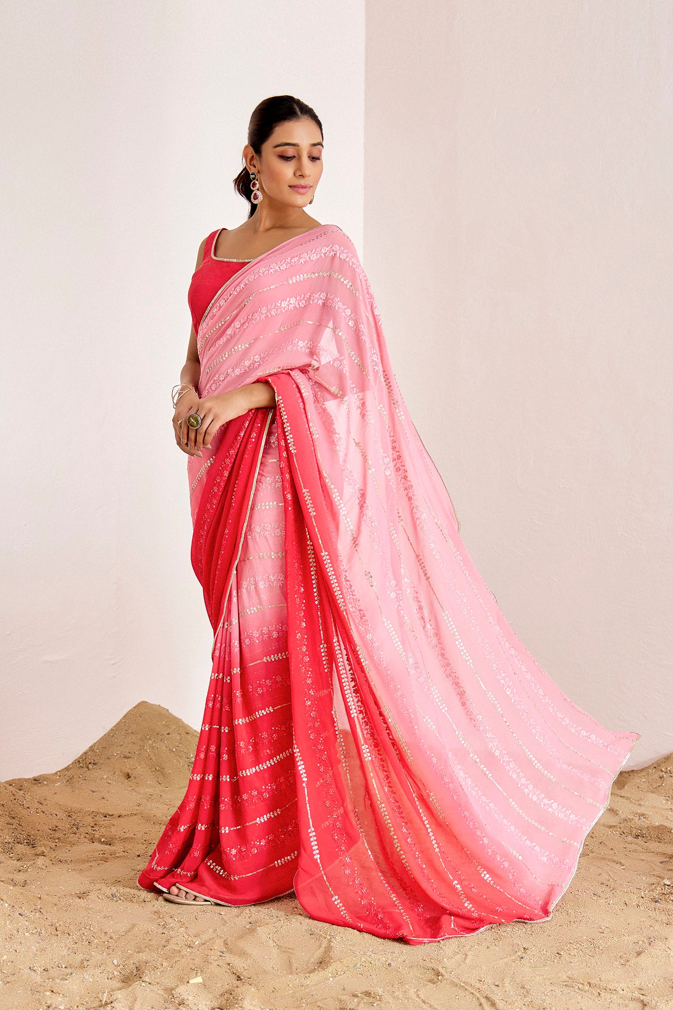 Horizontal sequin and thread embroidery saree with metallic lace all over; paired with plain sleeveless blouse.