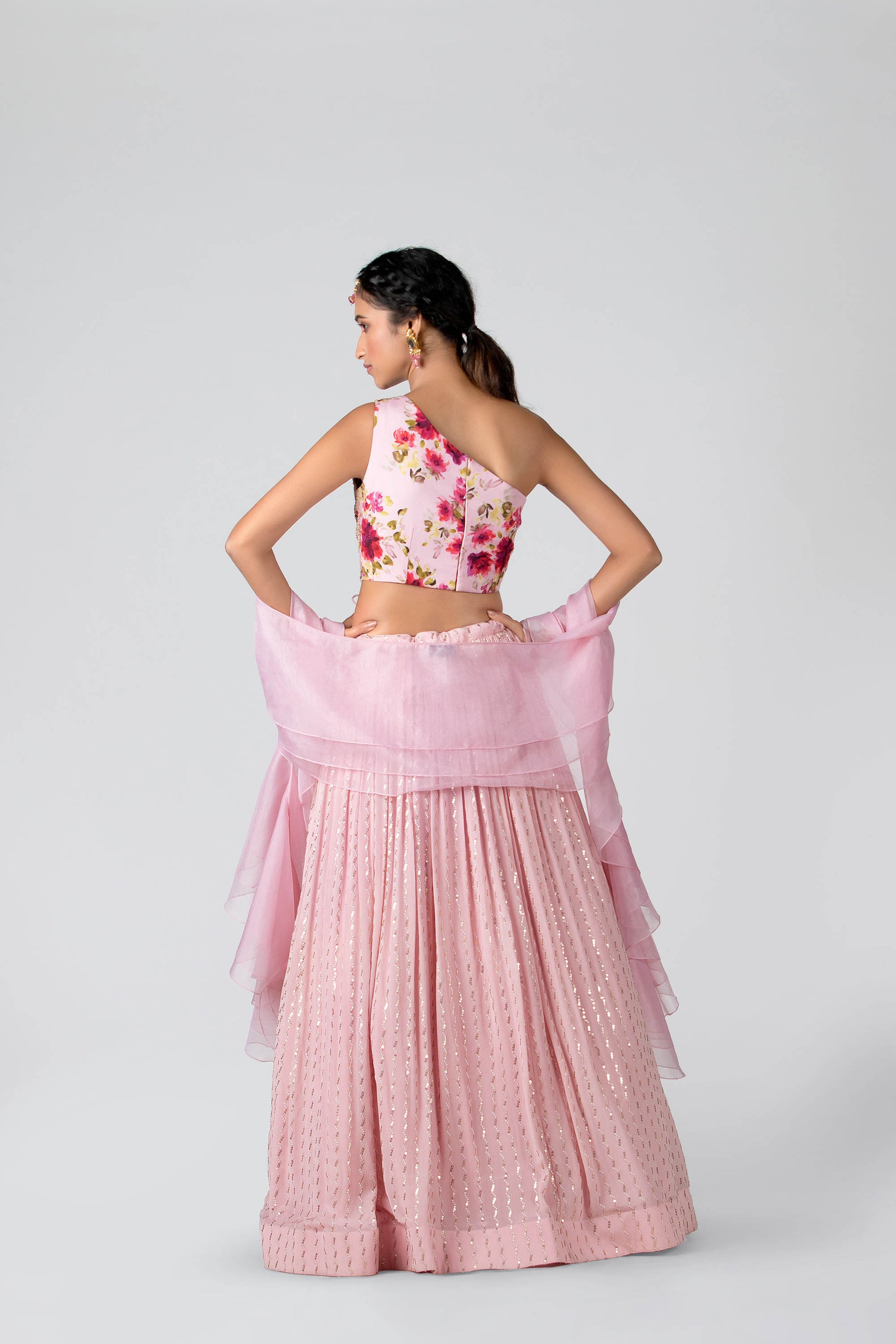 One shoulder lehenga with zardosi hand embroidery crop top.