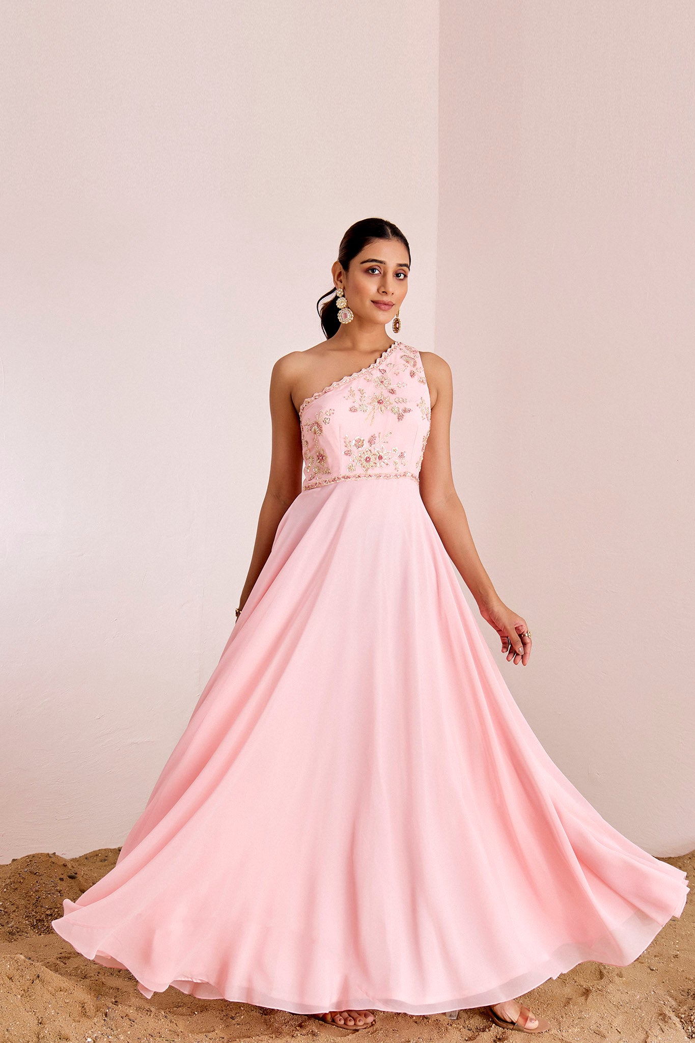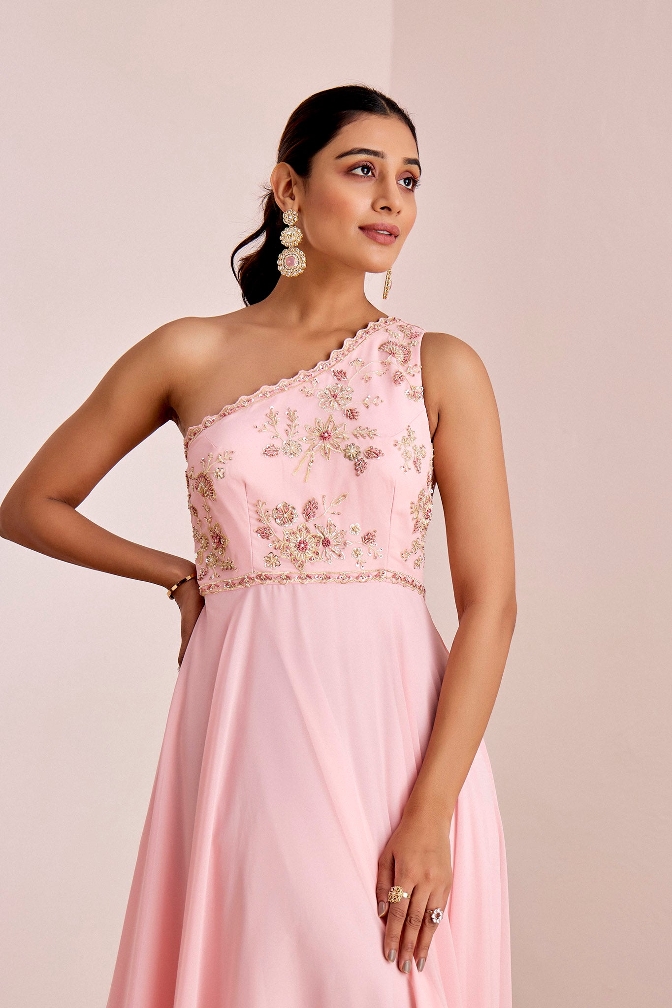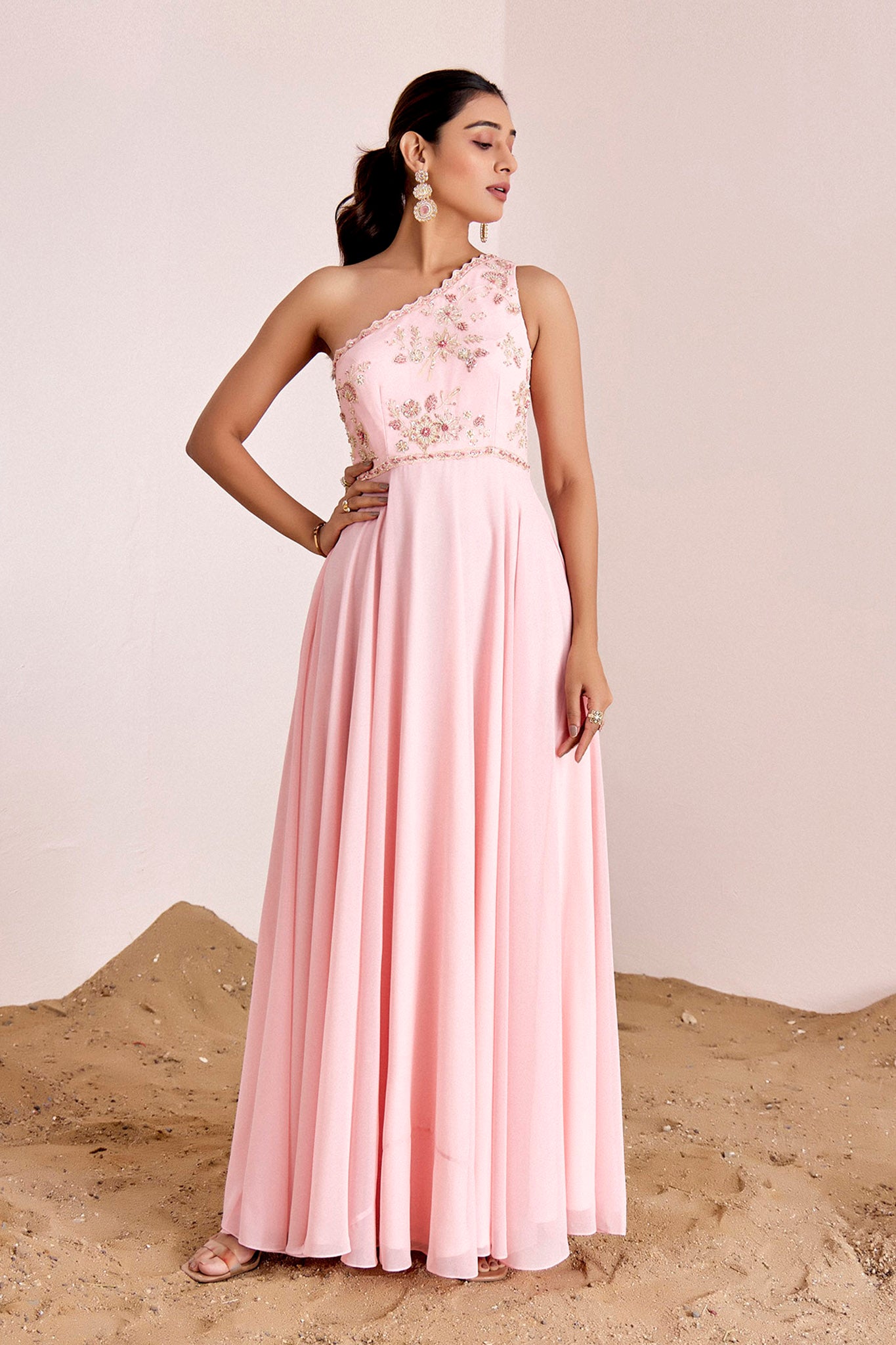 One shoulder hand embroidered gown with cutwork details on the neckline.