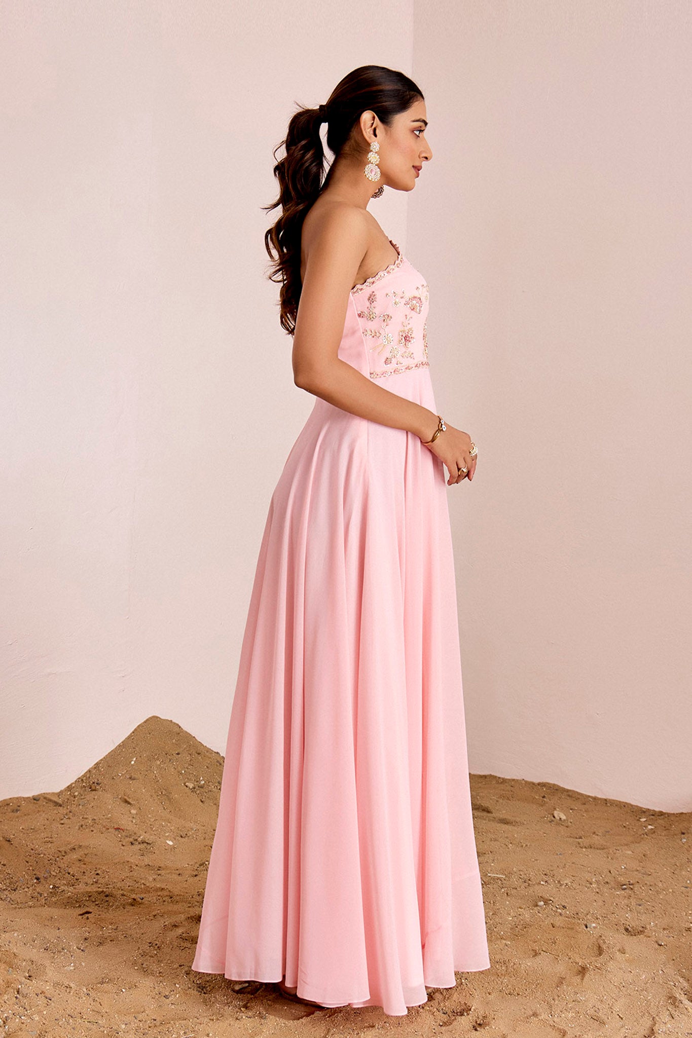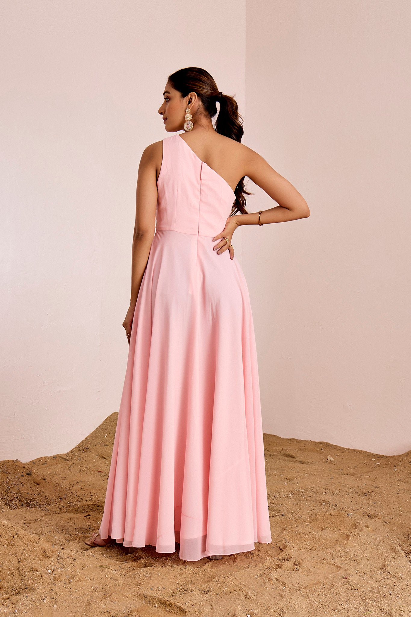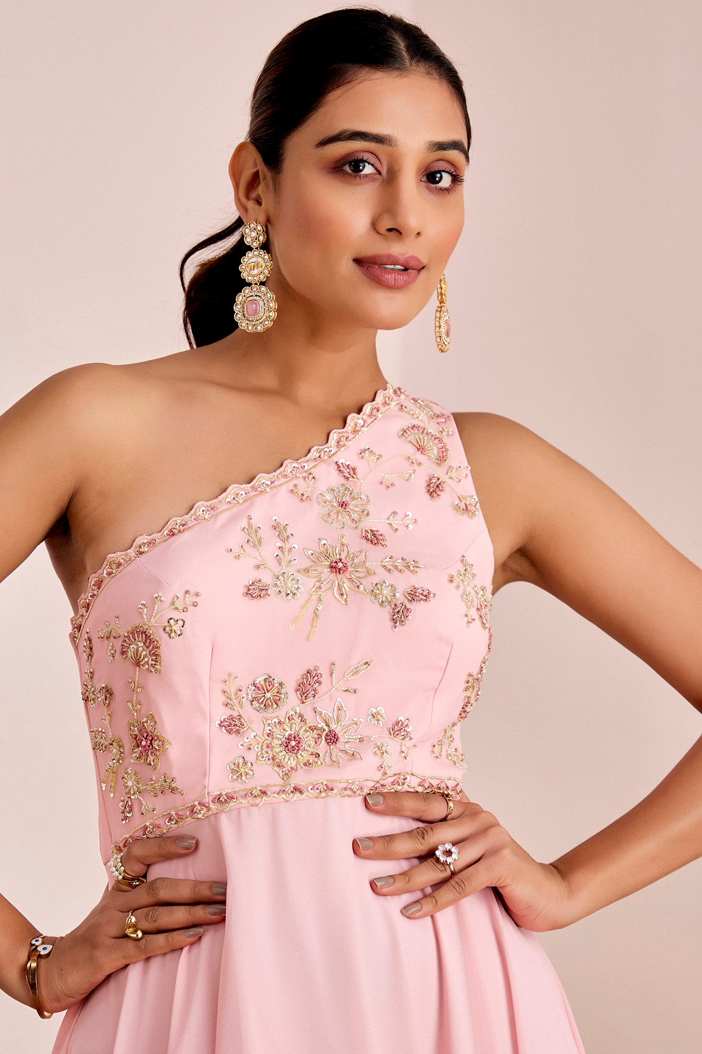 One shoulder hand embroidered gown with cutwork details on the neckline.