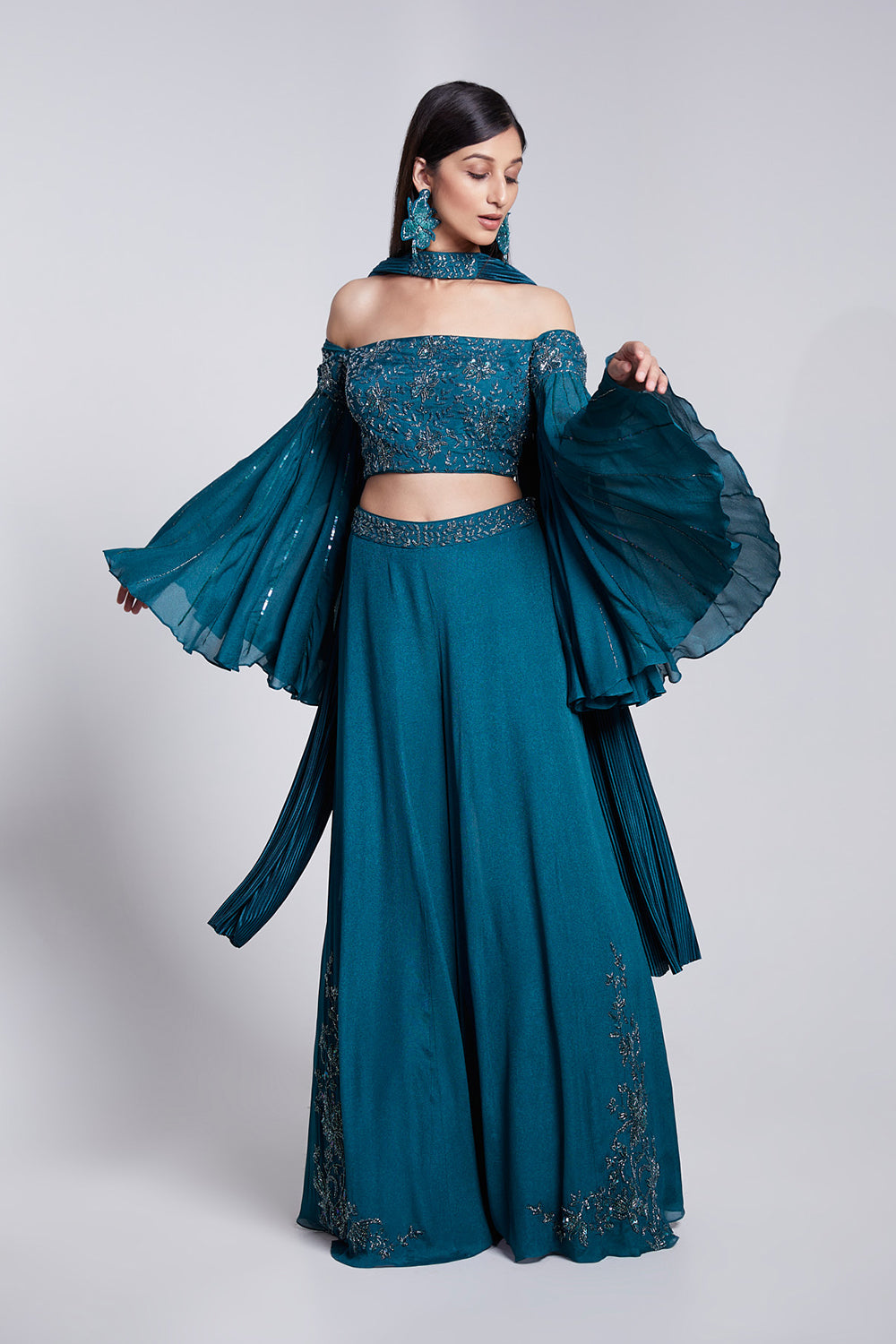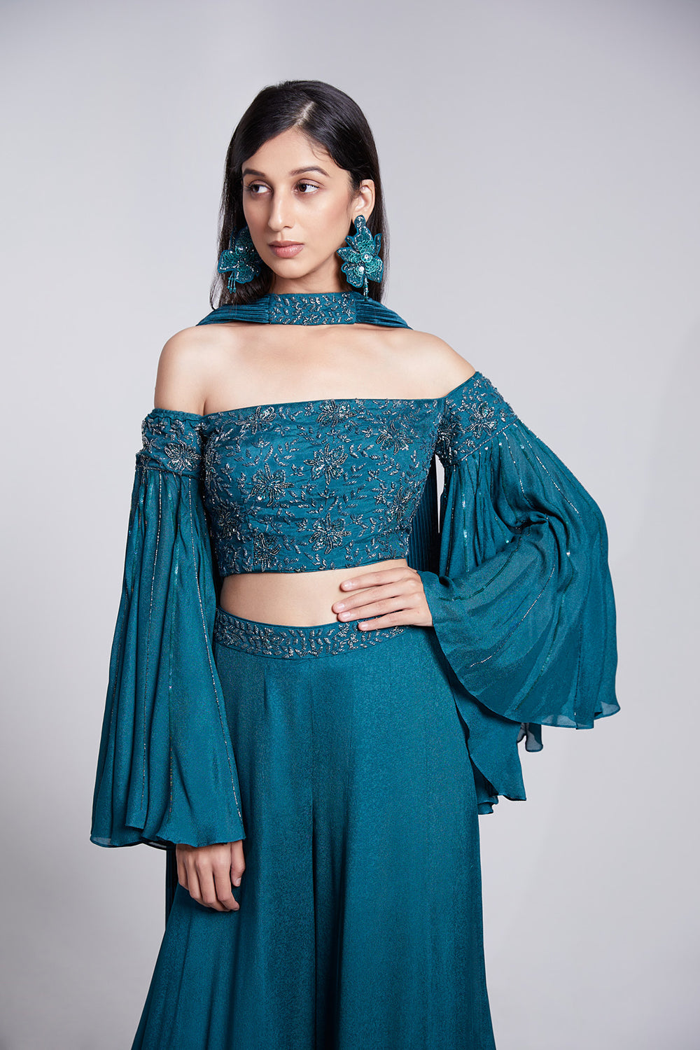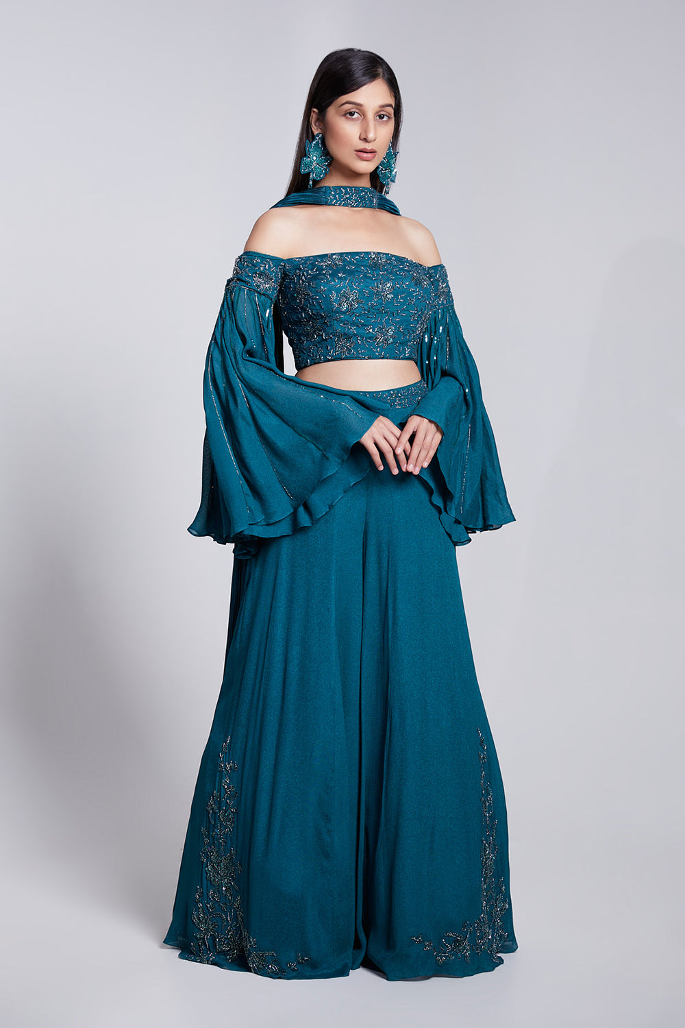 Off shoulder top with bell sleeve. The top is completely embriodered. It is paired with a choker dupatta.