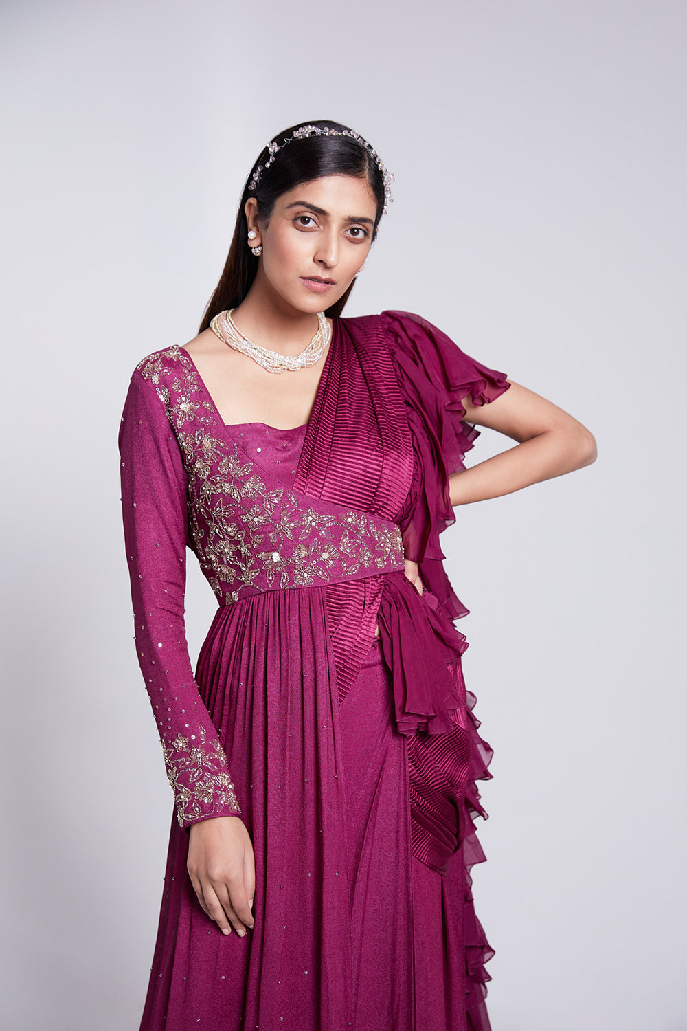 - Ruffle pre draped saree