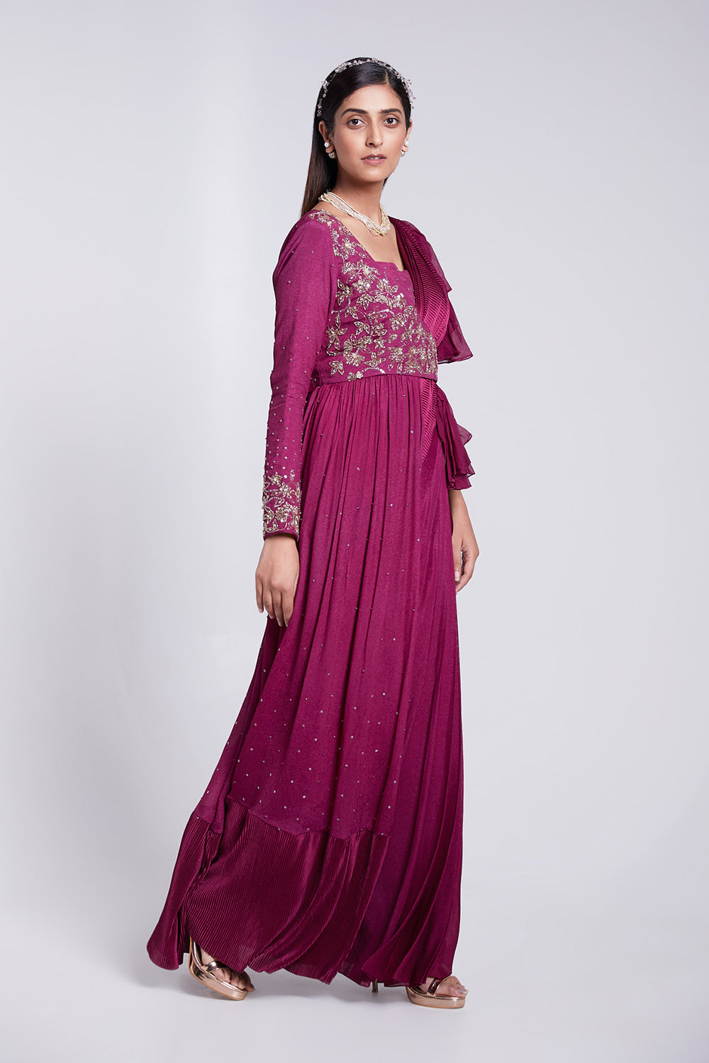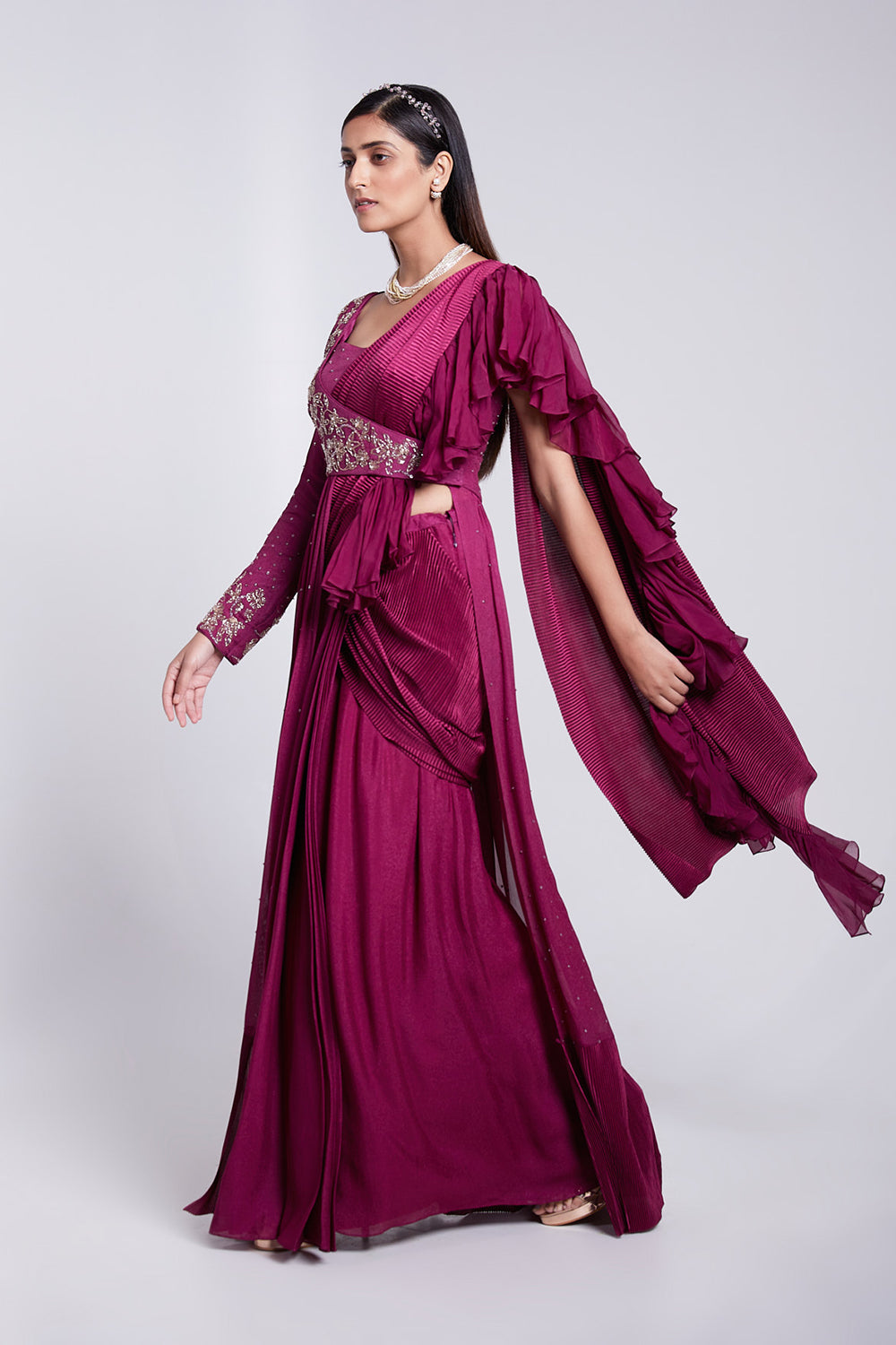 Beautifully hand crafted saree set having pre pleated Crush pallu. The jacket is fully flared giving a gown effect from behind.