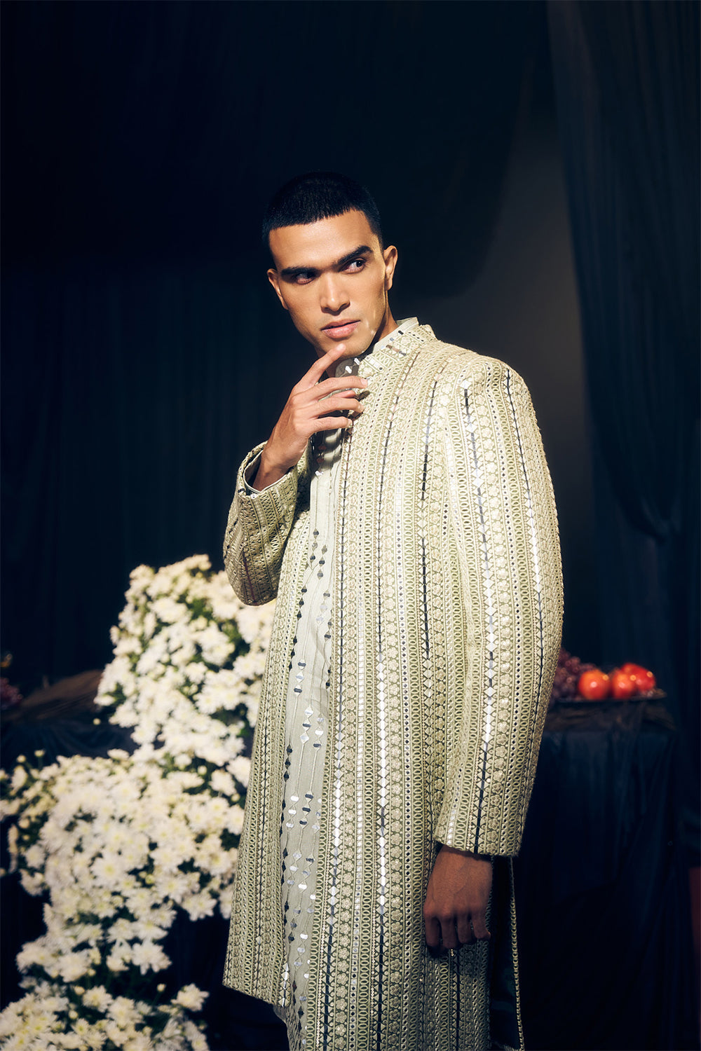 A refreshing sea green kurta set adorned with elegant mirror work, paired with off-white pants.