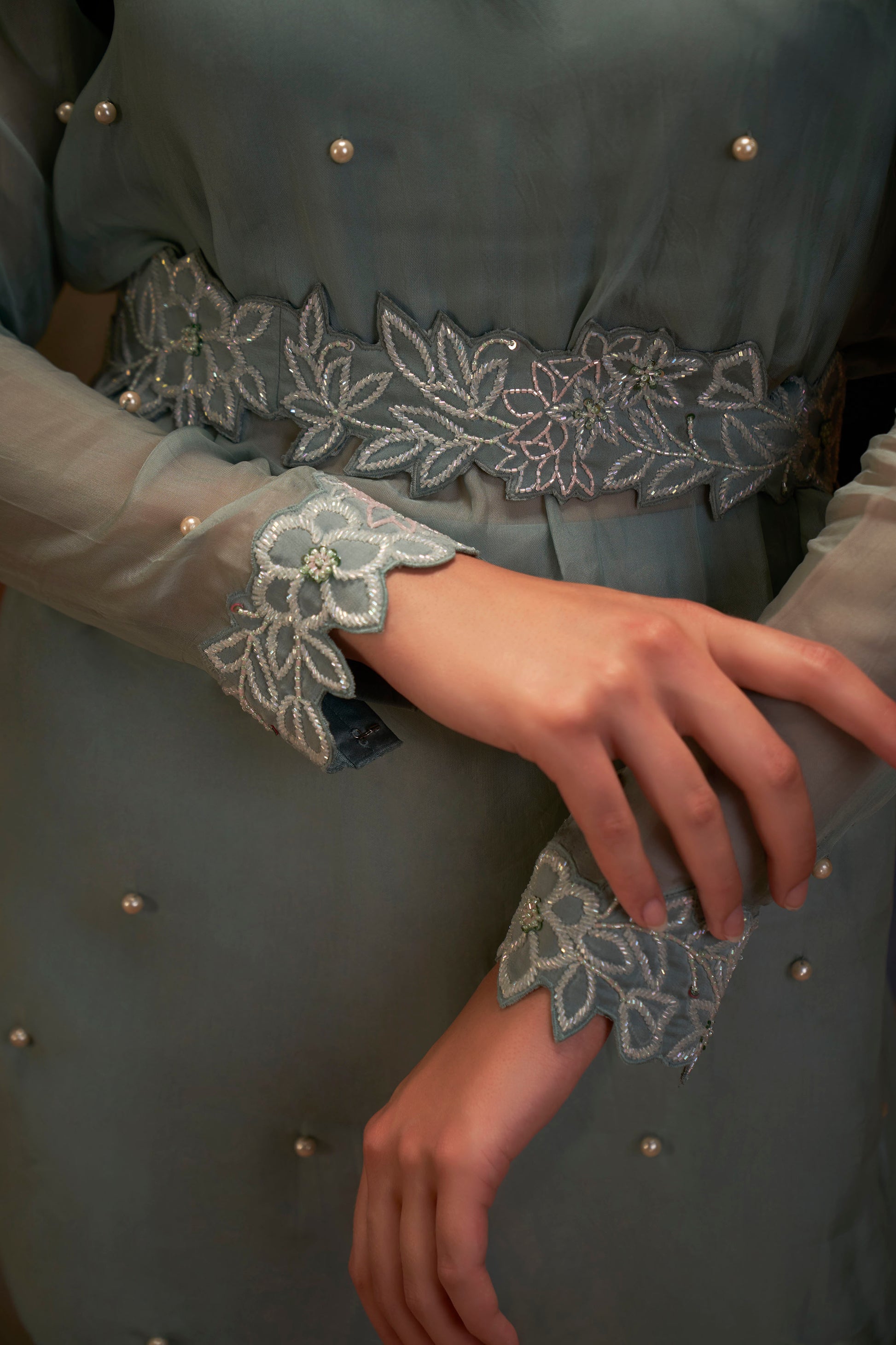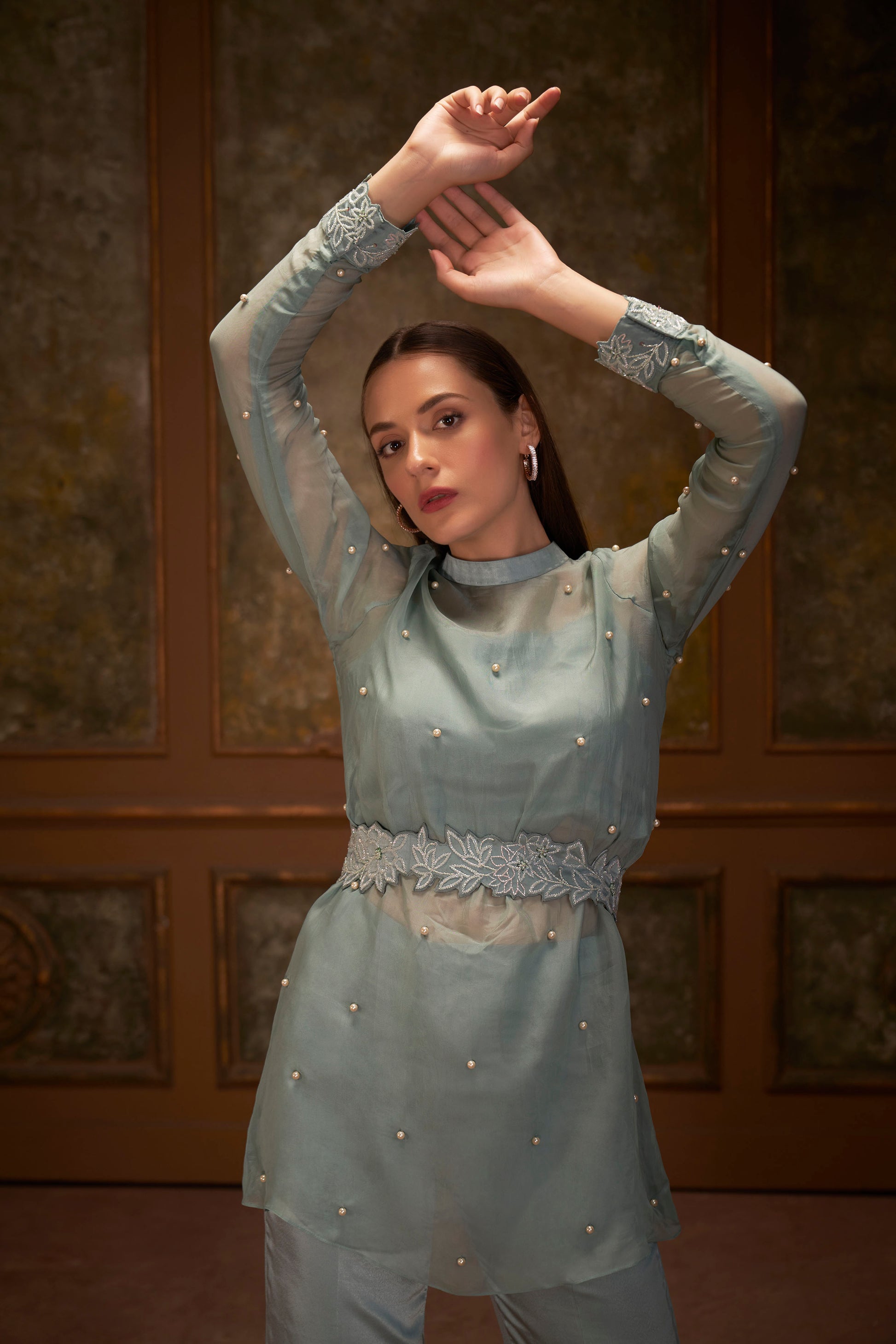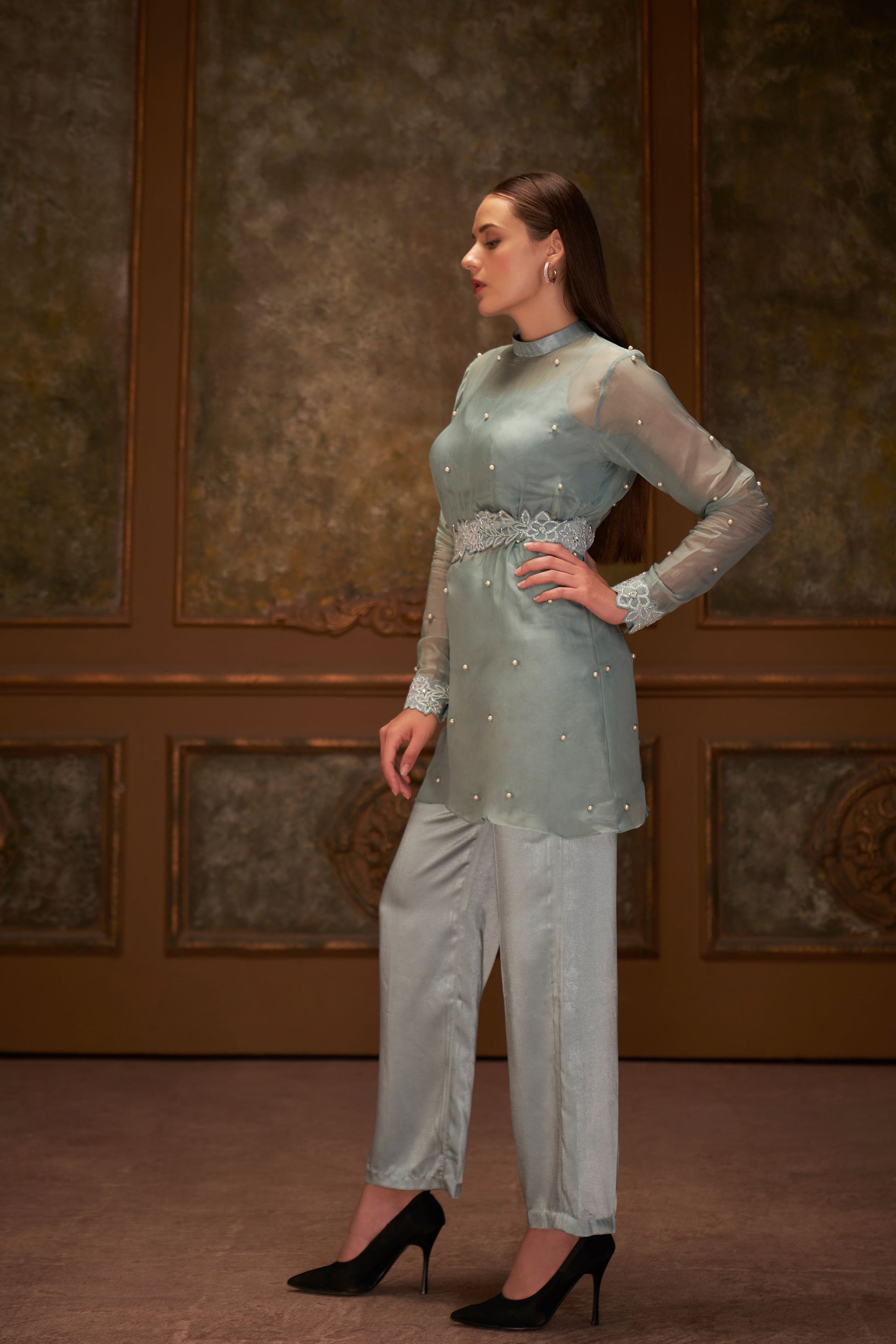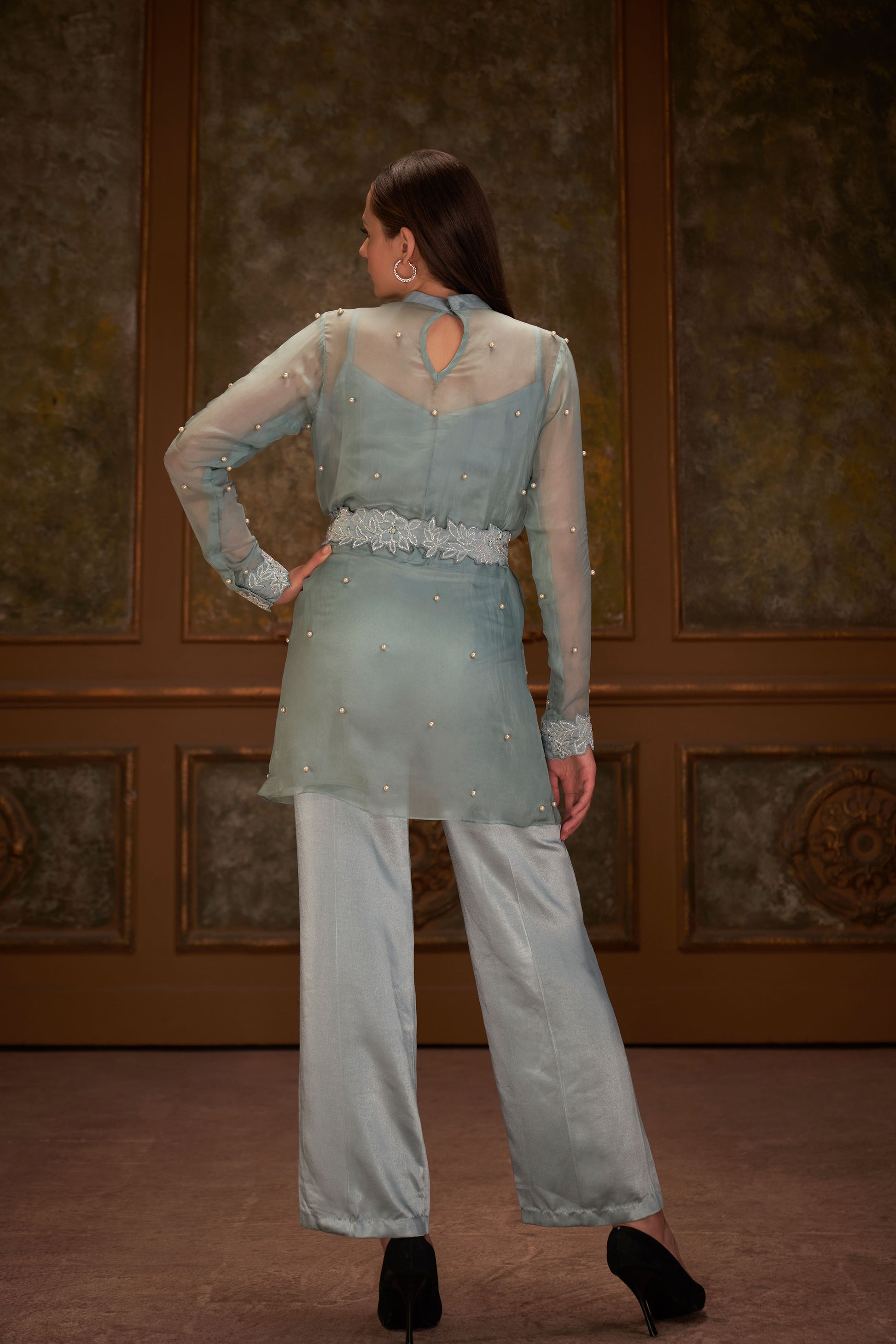 Beautiful organza shirt in pearls. The belt is embroidered. Paired