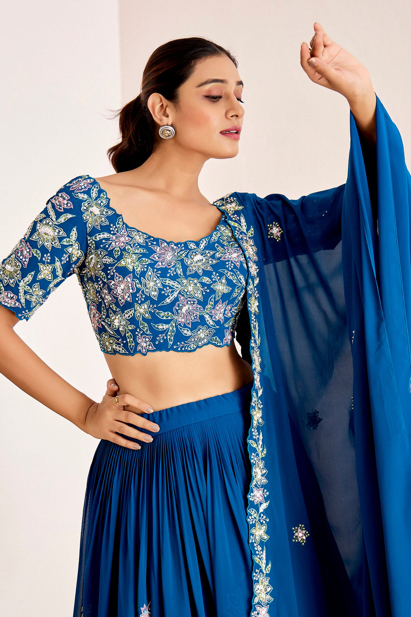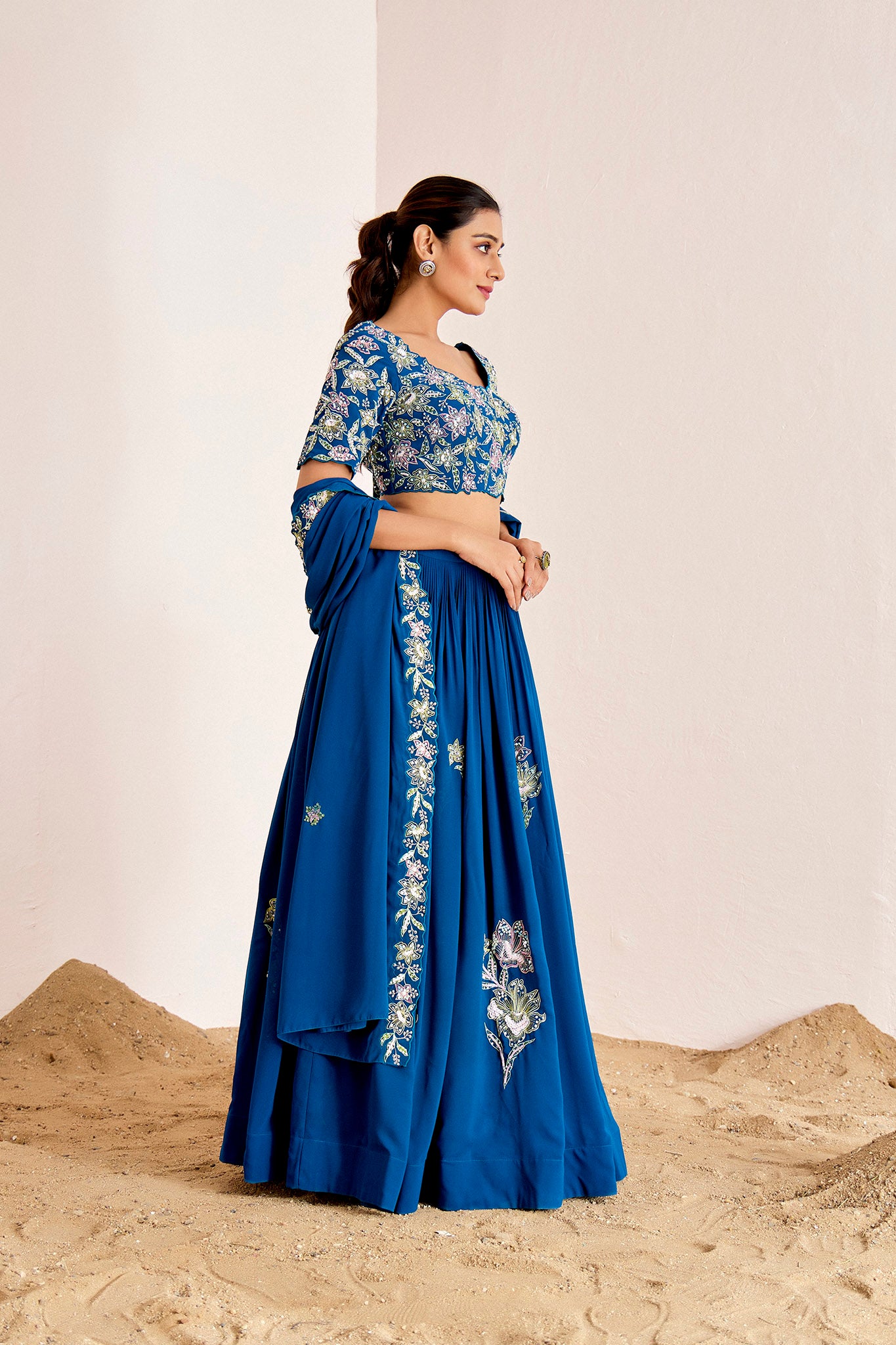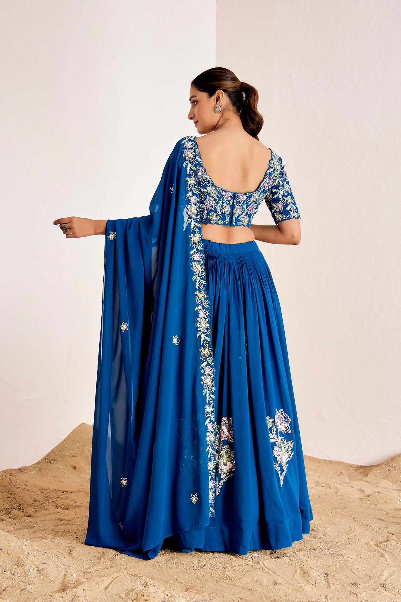 Thread embroidered lehenga with pearl and sequin handwork details. Georgette dupatta with cutwork on one side.
