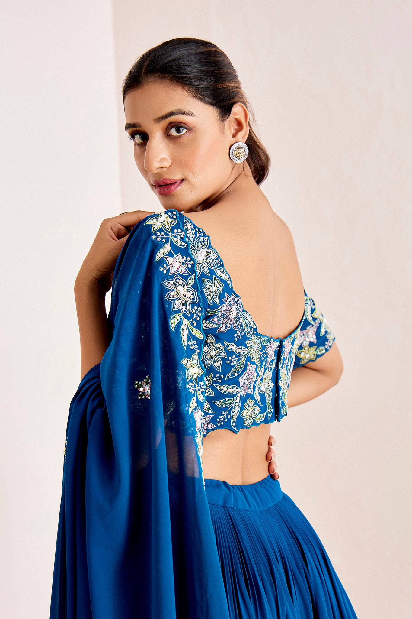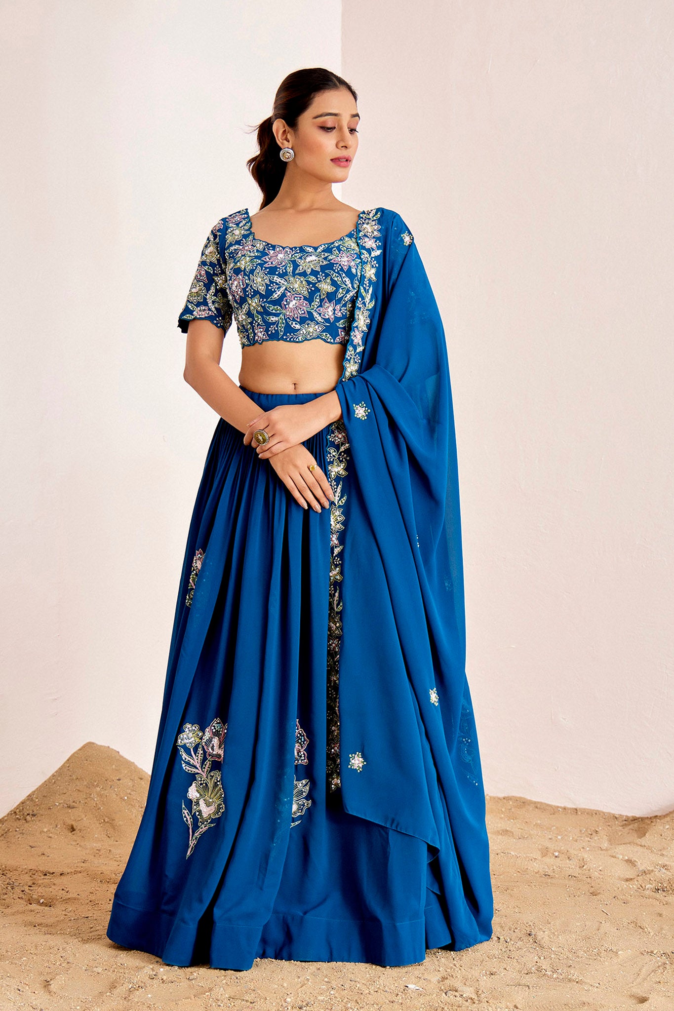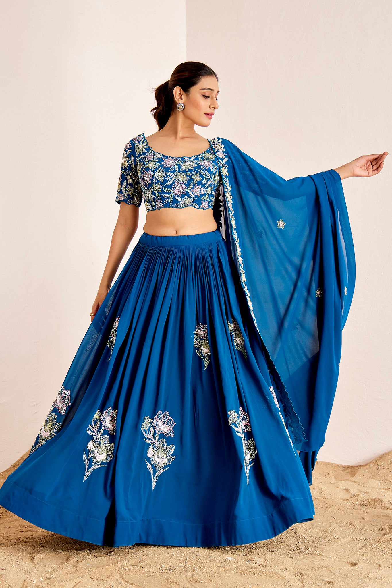 Thread embroidered lehenga with pearl and sequin handwork details. Georgette dupatta with cutwork on one side.