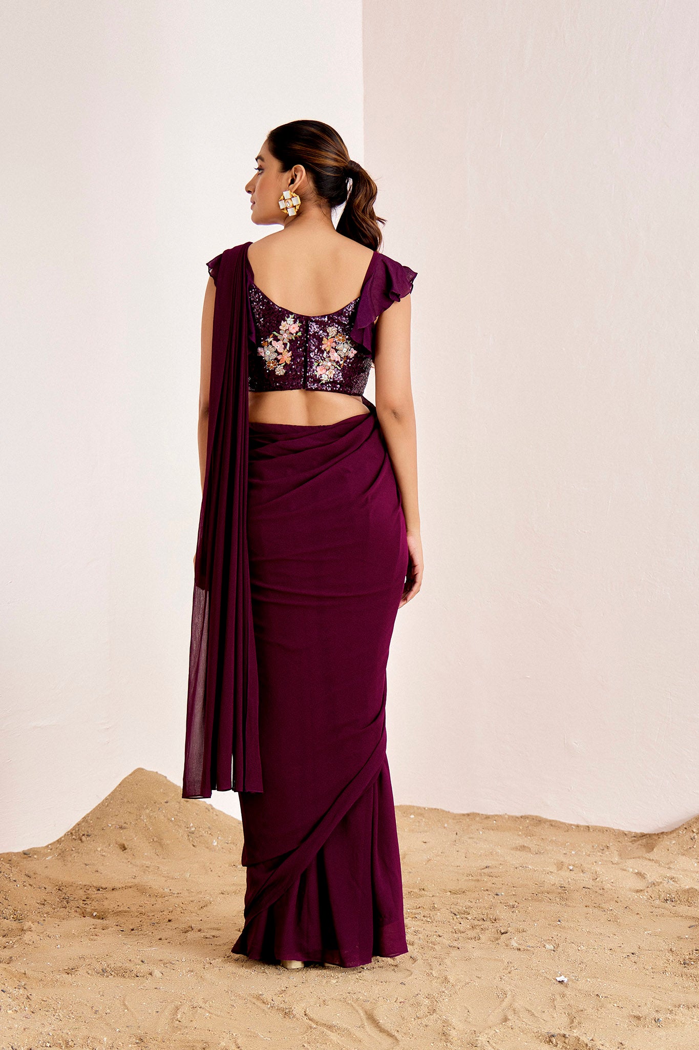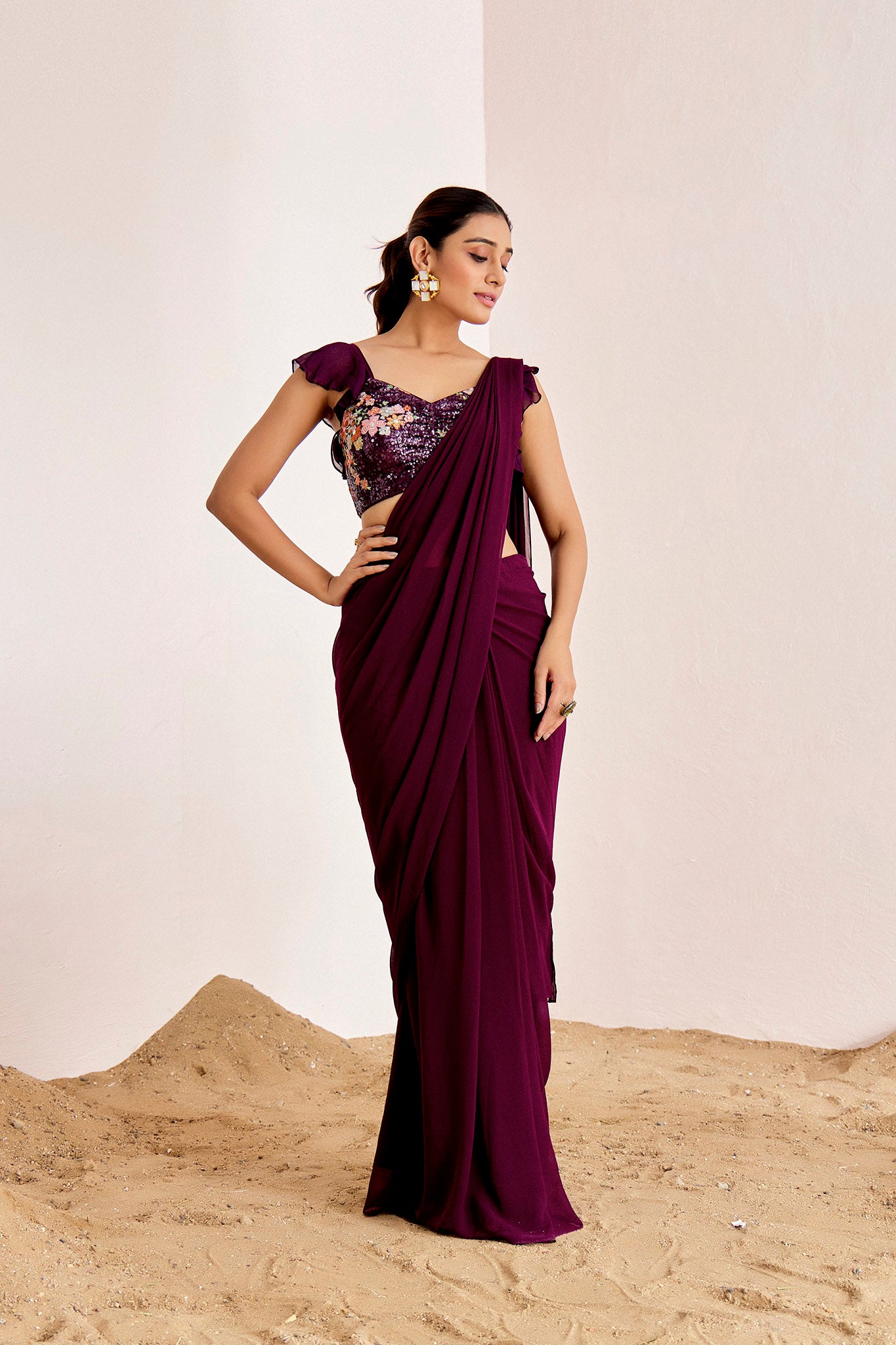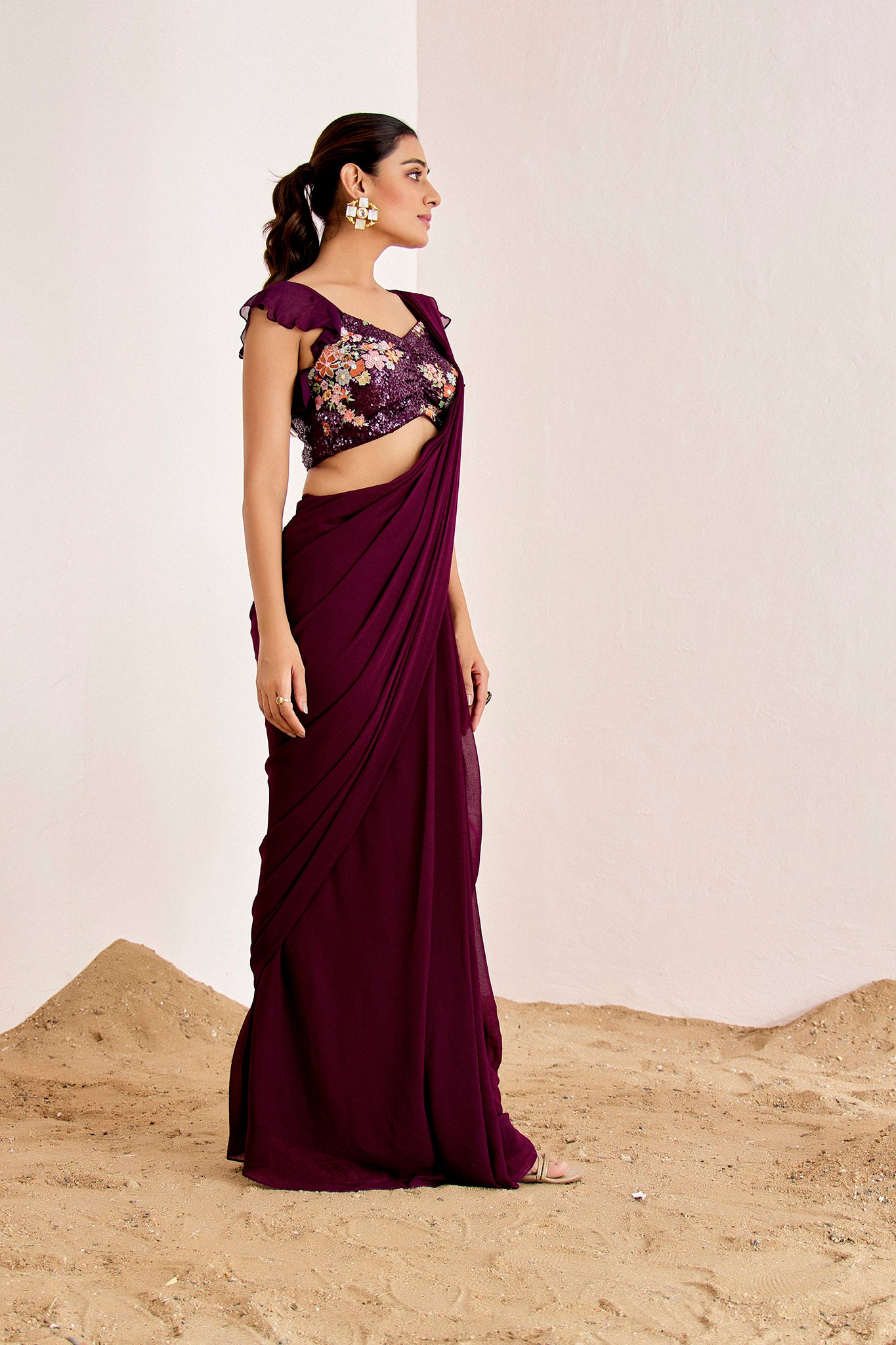 Pre drape saree and embellished blouse with ruching details on centre front.