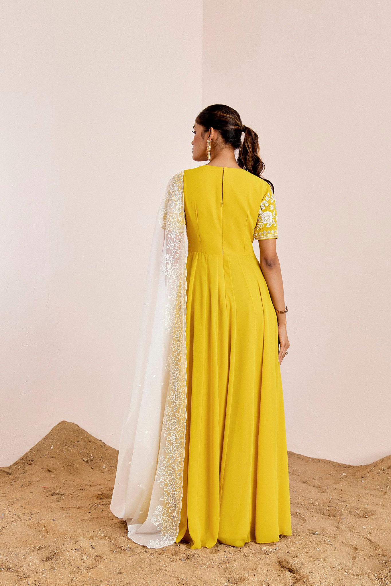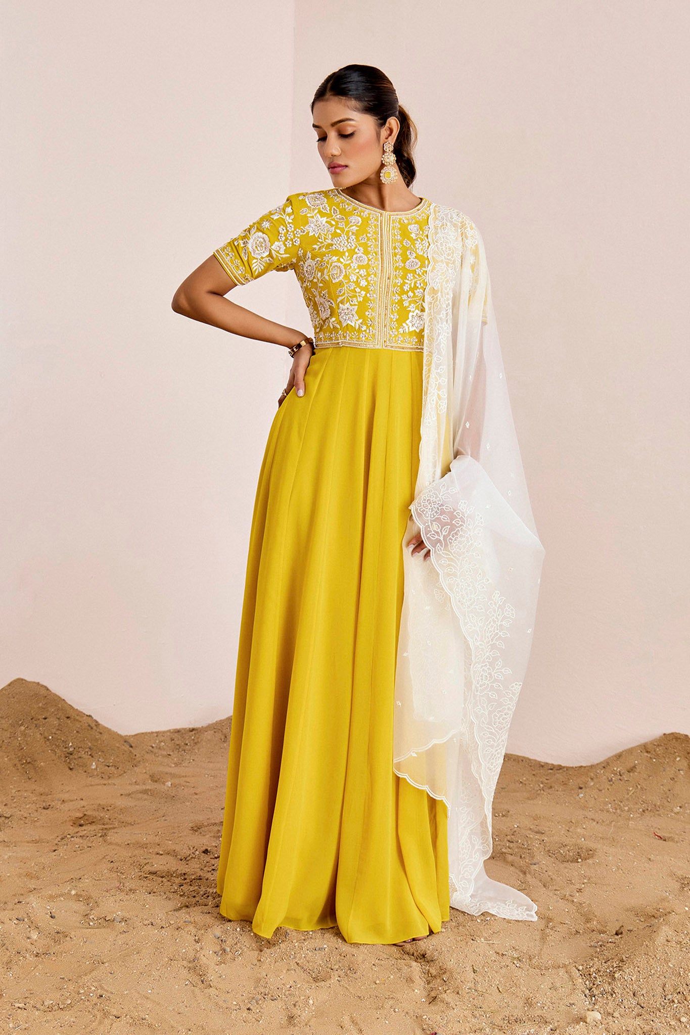 YELLOW ANARKALI WITH OFF WHITE DUPATTA