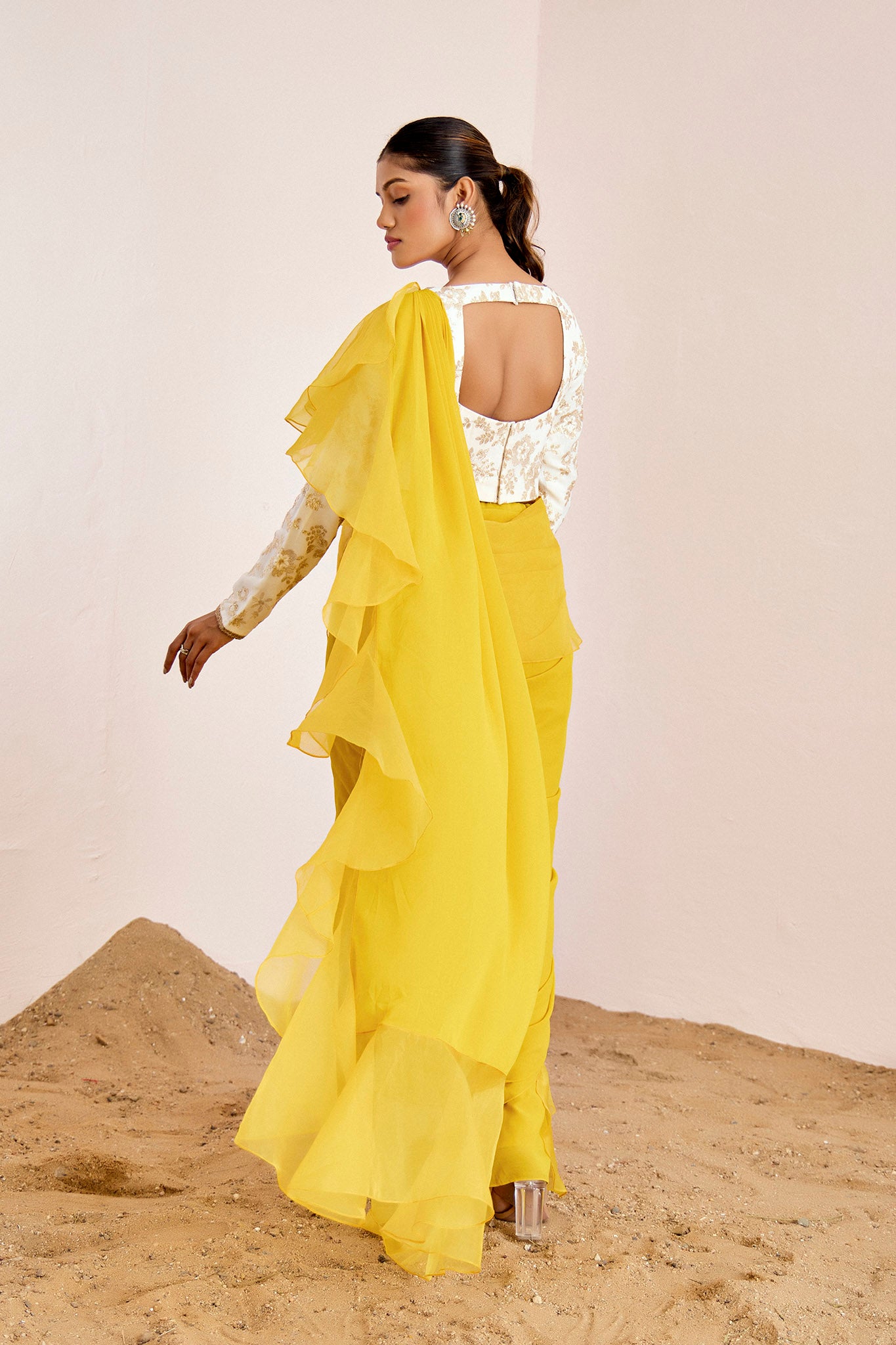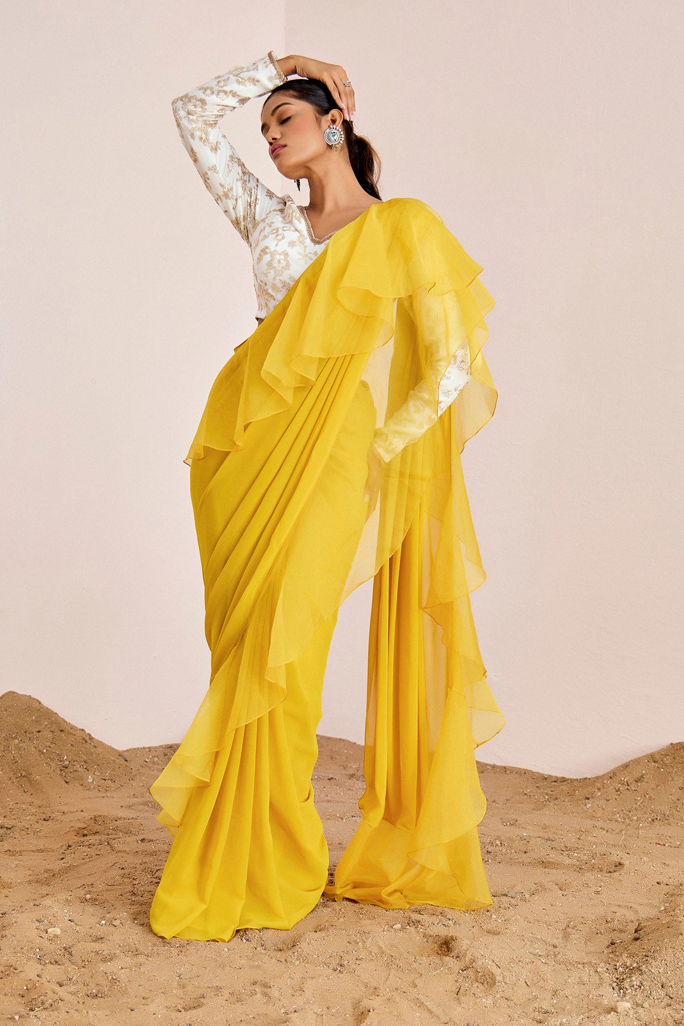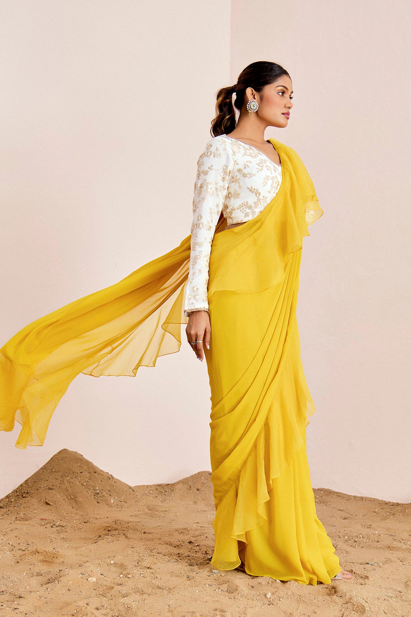Pre drape saree with organza ruffles and sequin embroidery blouse.