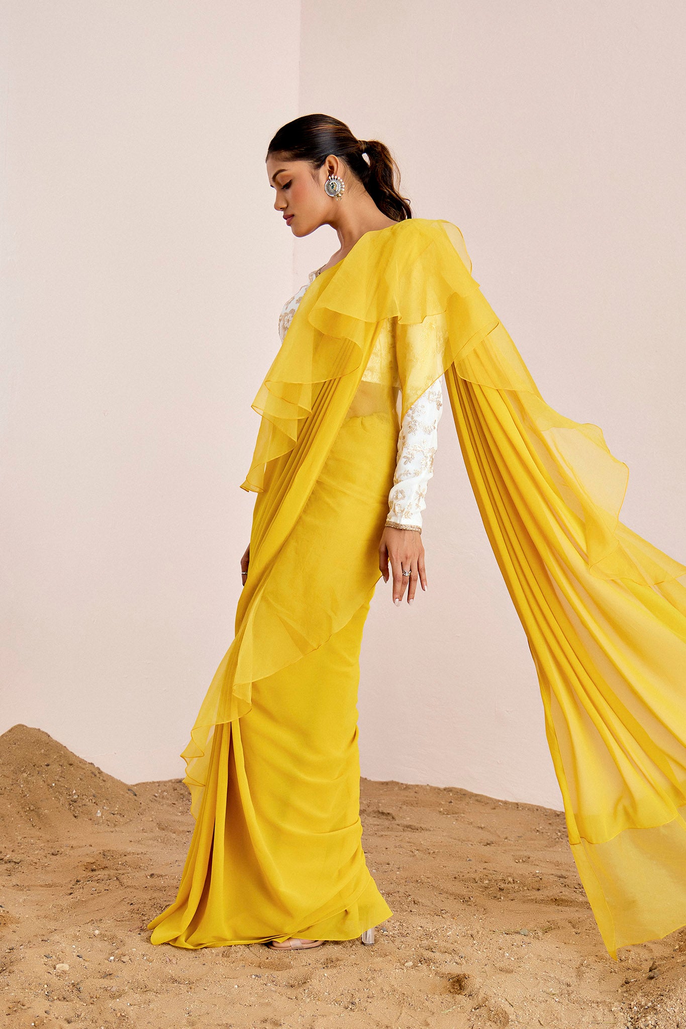YELLOW PRE DRAPE SAREE WITH WHITE BLOUSE